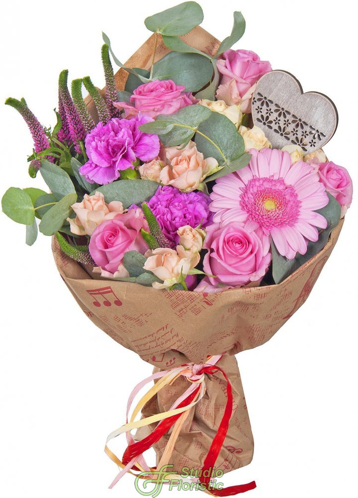 Гермини (1 шт.); Роза (5 шт.); Роза кустовая (3 шт.); Гвоздика (2 шт.); Вероника (2 шт.); Эвкалипт; Упаковка | 3649 | |