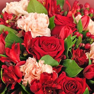 Роза (5шт.); Тюльпан (7шт.); Гвоздика (6шт.); Альстромерия (5шт.); Гиперикум (4шт.); Салал; Упаковка | 3649 | 5449 |