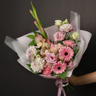 Букет из Гортензии, Георгин, Гладиолуса и Эустомы «Розовый закат»