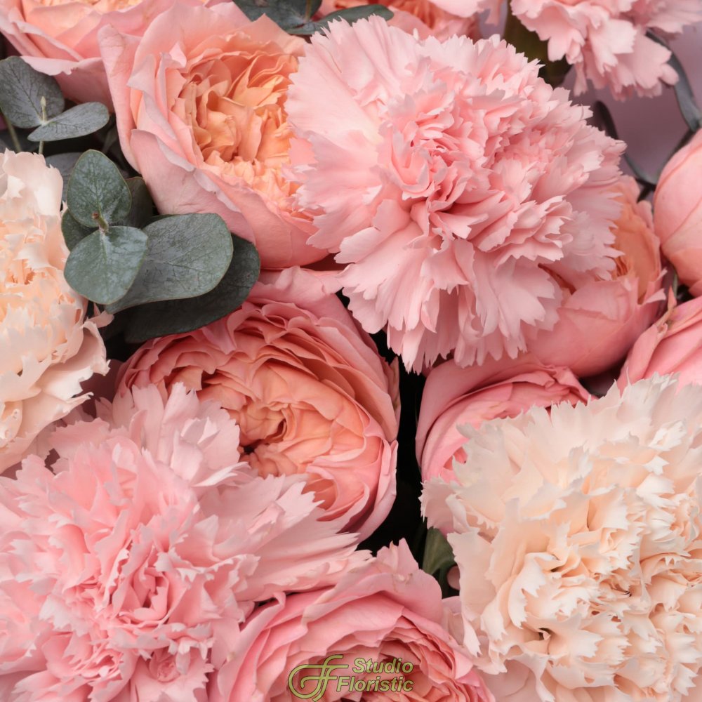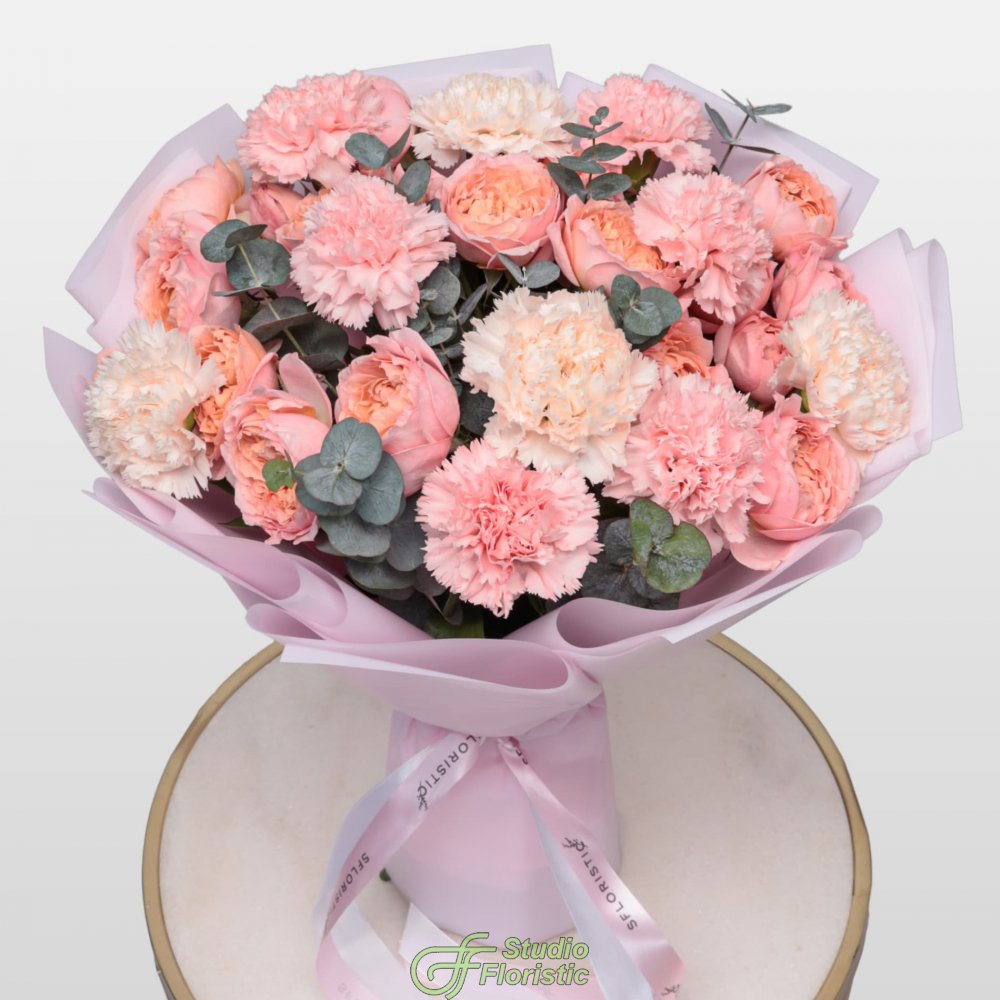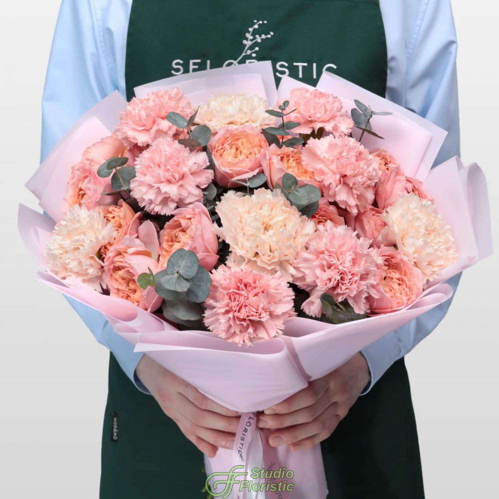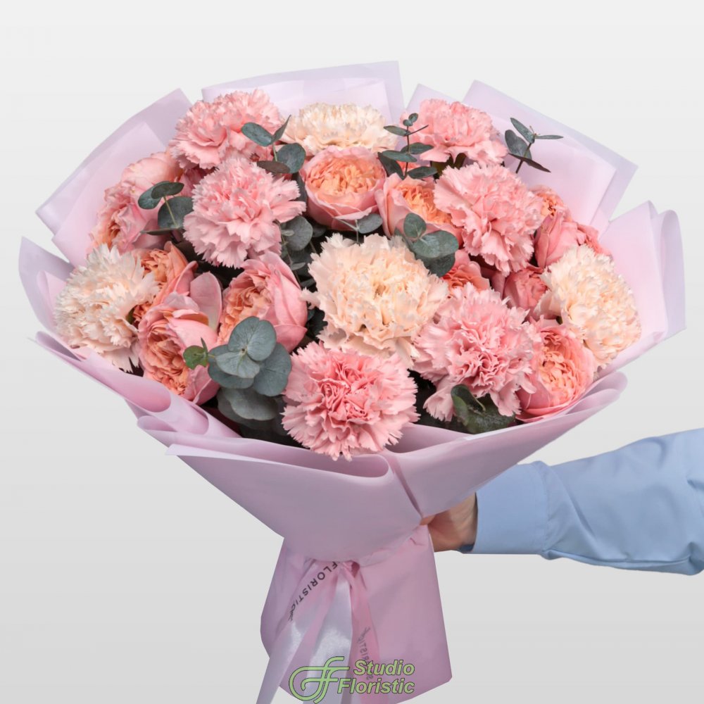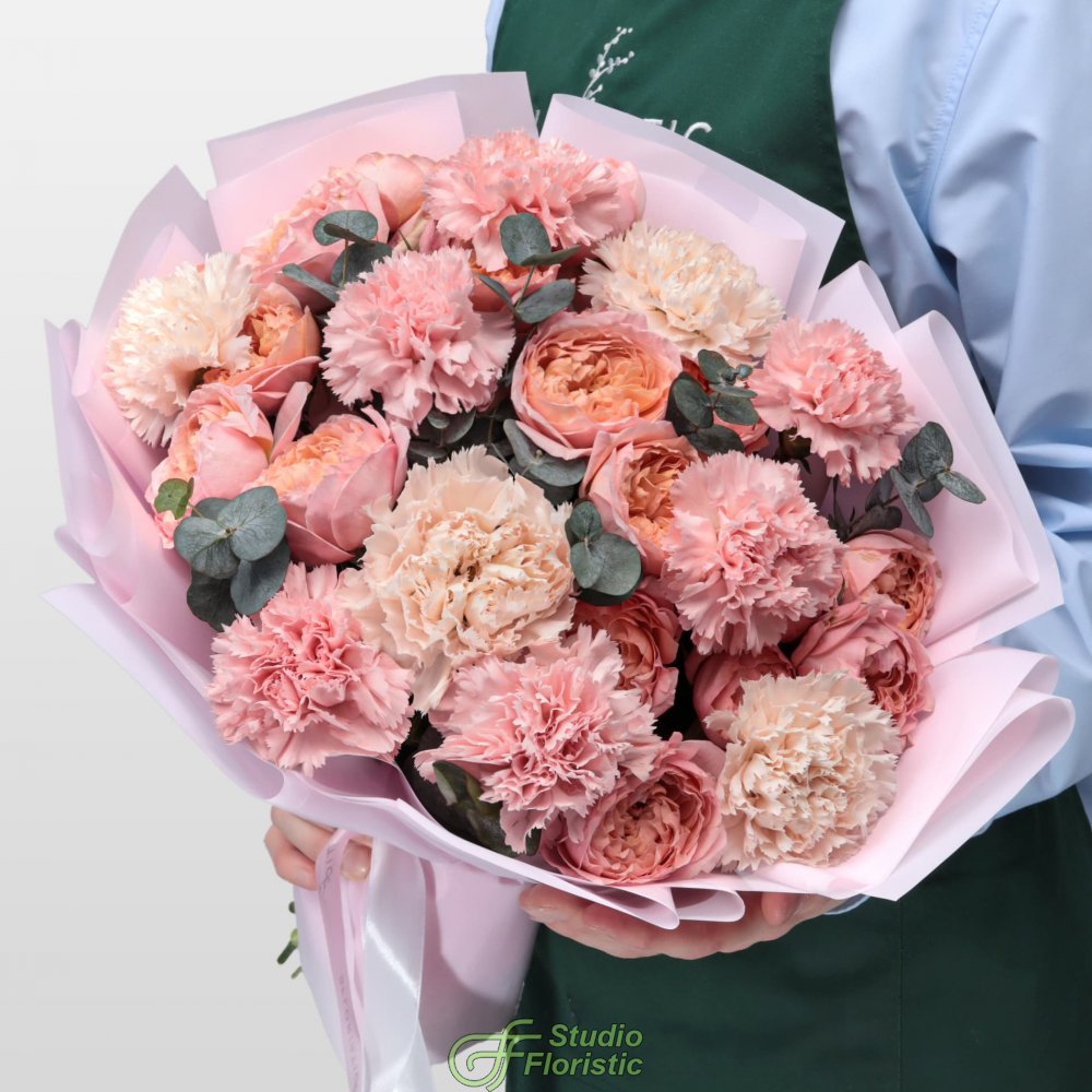Букет из Гвоздик и Кустовых Пионовидных Роз «Мечтатели»