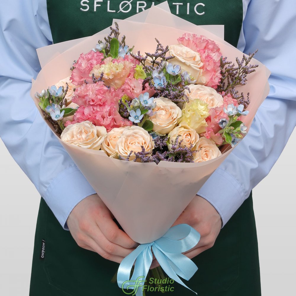 Эустома (8шт.); Кустовая Роза (8шт.); Оксипеталум (9шт.); Лимониум (8шт.); Упаковка; Атласная лента | 7199 | 11549 |