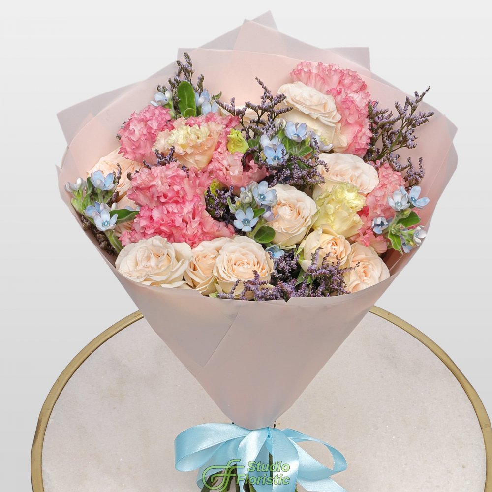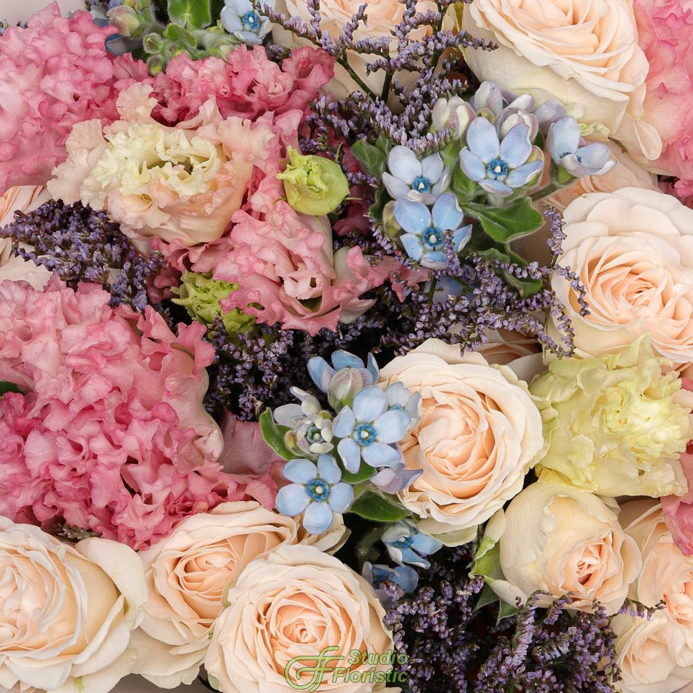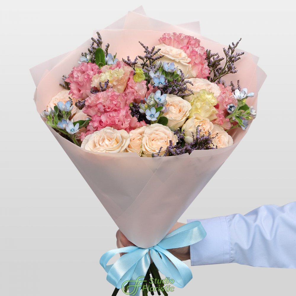 Эустома (4шт.); Кустовая Роза (4шт.); Оксипеталум (5шт.); Лимониум (6шт.); Упаковка; Атласная лента | 4549 | 7299 |