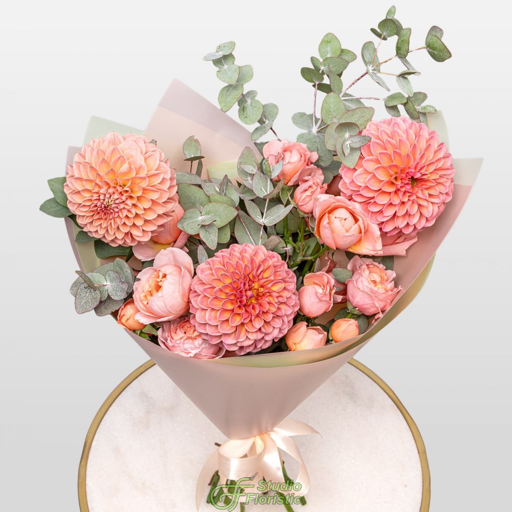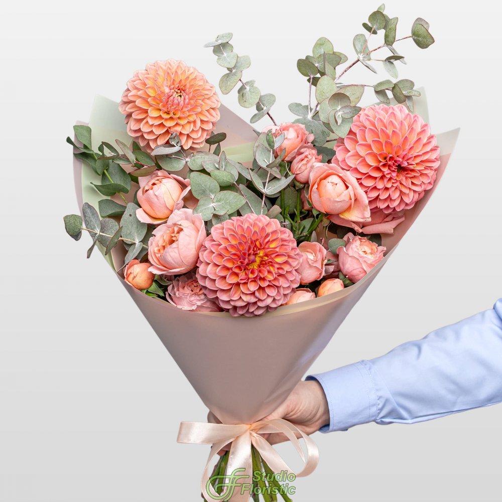Георгин (7шт.); Пионовидная кустовая роза (9шт.); Эвкалипт; Упаковка; Атласная лента | 6049 | 9699 |