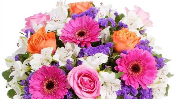 Оранжевые розы (3 шт.); Розовые розы (3 шт.); Розовые герберы (3 шт.); Статица (2 шт.); Белая альстромерия (2 шт.) | 2549 | 3699 |