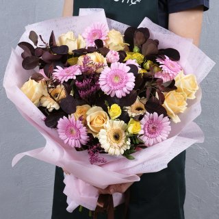 Гермини (8шт.); Роза Пич Аваланш (7шт.); Роза кустовая (5шт.); Лимониум (3шт.); Котинус; Писташ; Упаковка | 5599 | 8699 |