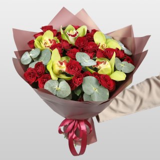 Роза кустовая (10 шт.); Орхидея Цимбидиум (5 шт.); Эвкалипт; Упаковка; Атласная лента | 4599 | 7149 |