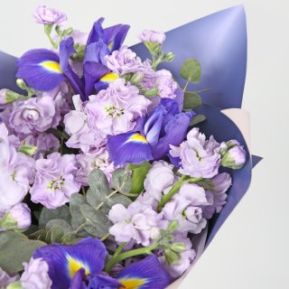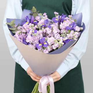 Маттиола (9шт.); Ирис (11шт.); Эвкалипт; Матовая пленка; Атласная лента | 4049 | 6299 |
