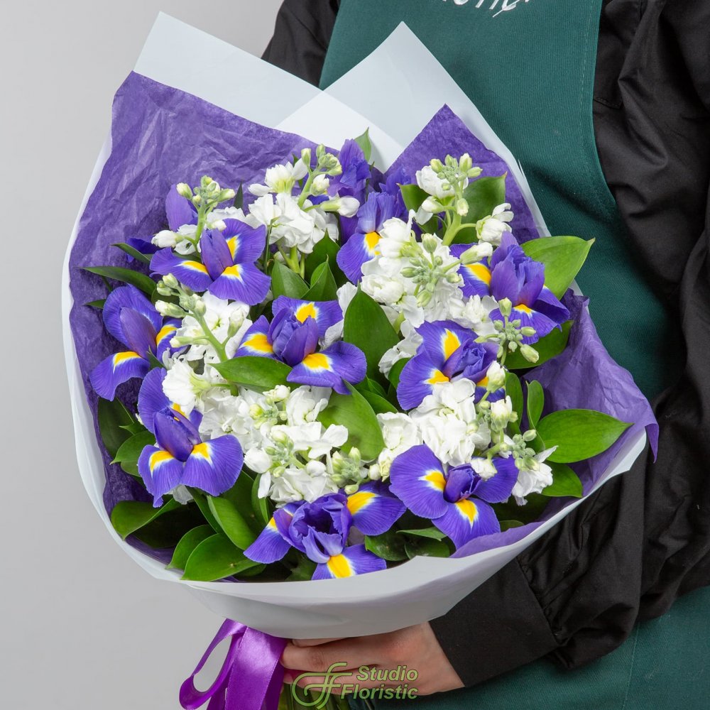 Маттиола кустовая (7шт.); Ирис (15шт.); Рускус; Тишью; Матовая пленка; Атласная лента | 5599 | |