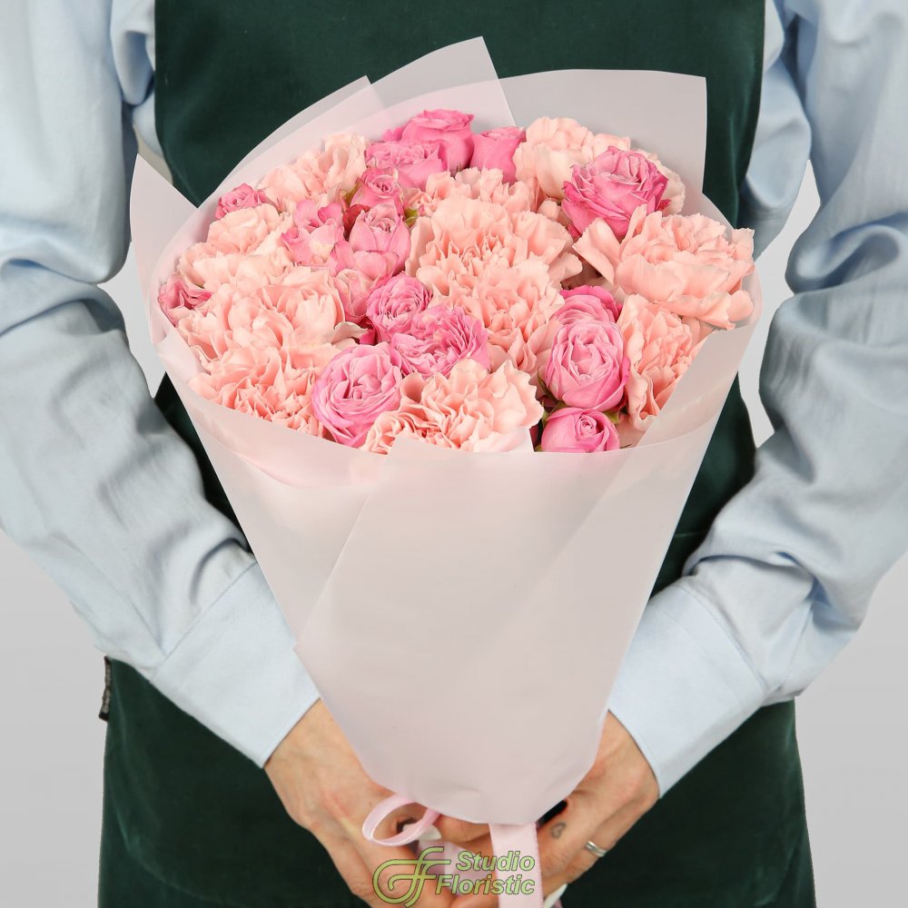 Букет из пионовидных Роз и Диантуса «Розовая нега»
