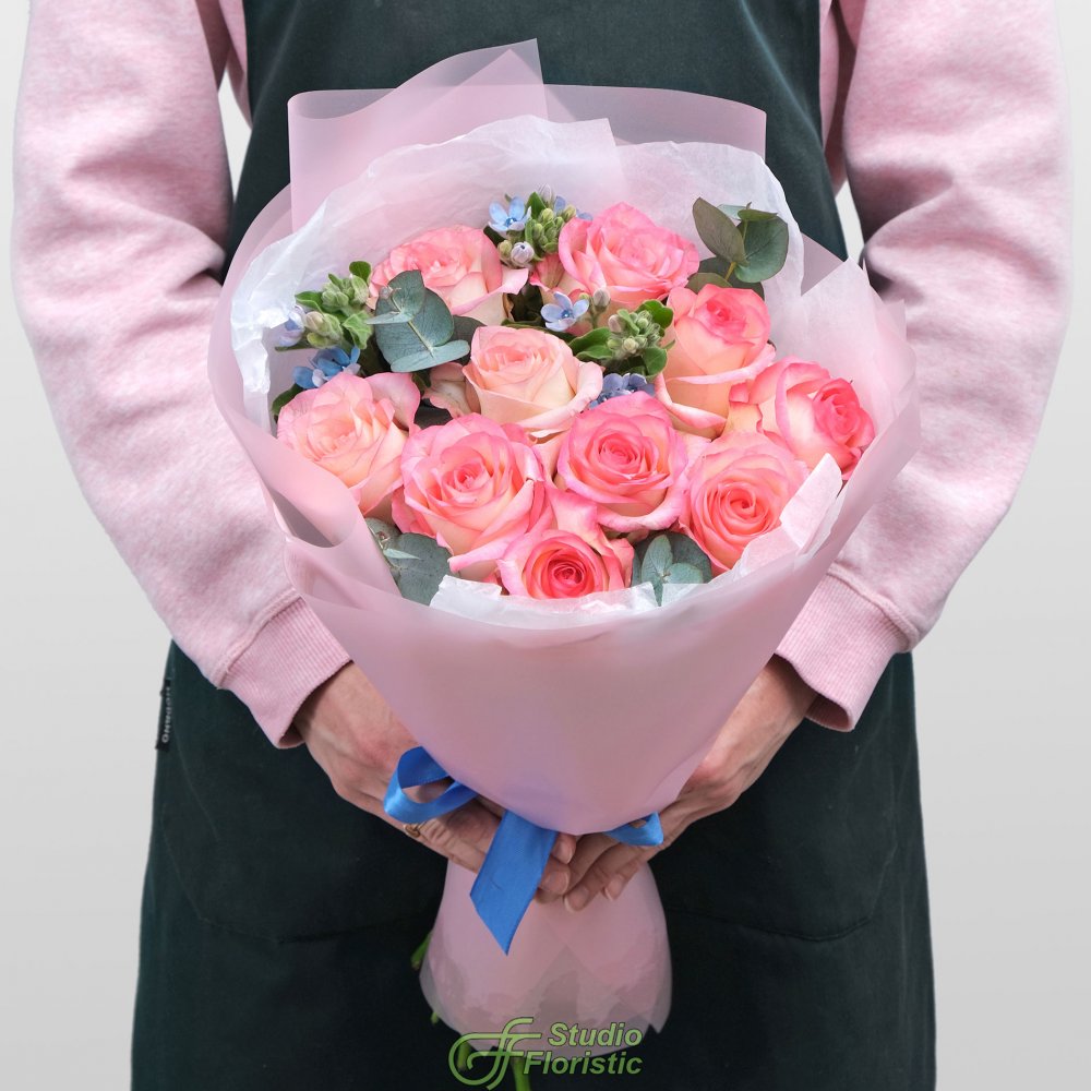 Роза Джумилия - 10шт.; Оксипеталум - 3шт.; Эвкалипт; Упаковка; Лента | 3249 | |