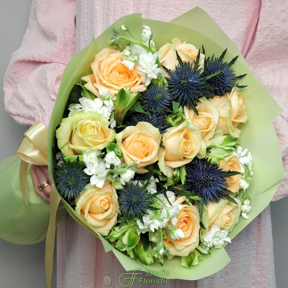 Роза (11шт.); Маттиола (6шт.); Эрингиум (2шт.); Альстромерия (5шт.); Упаковка; Атласная лента | 5599 | 8699 |