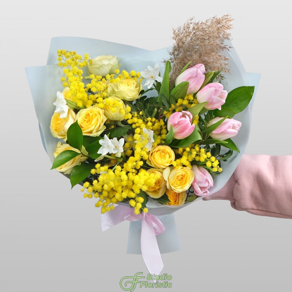 Мимоза (1шт.); Тюльпан (5шт.); Кустовые розы (3шт.); Нарцисс (4шт.); Писташ ветка; Рускус (1шт.); Упаковка; Лента | 3349 | 4999 |