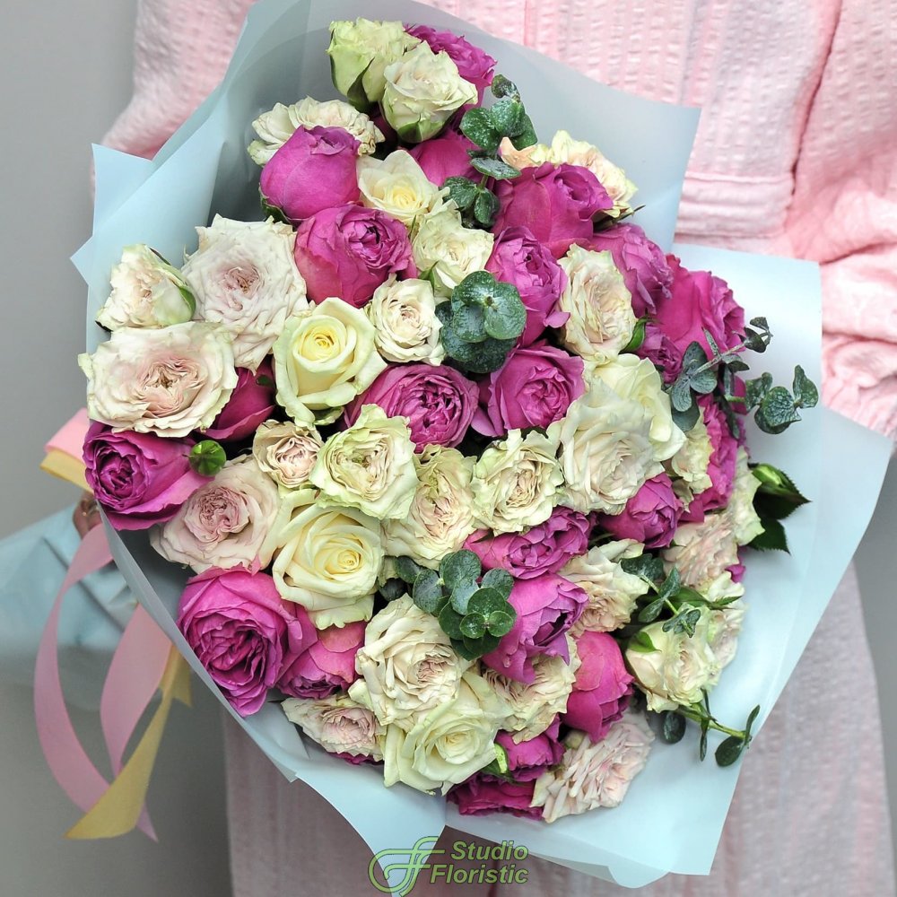 Роза кустовая (13шт.); Роза Мисти Баблс (12шт.); Писташ; Эвкалипт; Упаковка; Атласная лента | 8849 | 14599 |