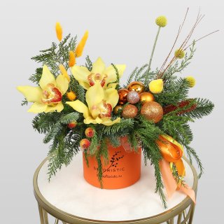Новогодняя композиция из Нобилиса в шляпной коробке «Зимний закат»