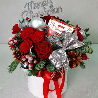 Новогодняя композиция из Нобилиса, Роз и Шишек «Рафаэлло»
