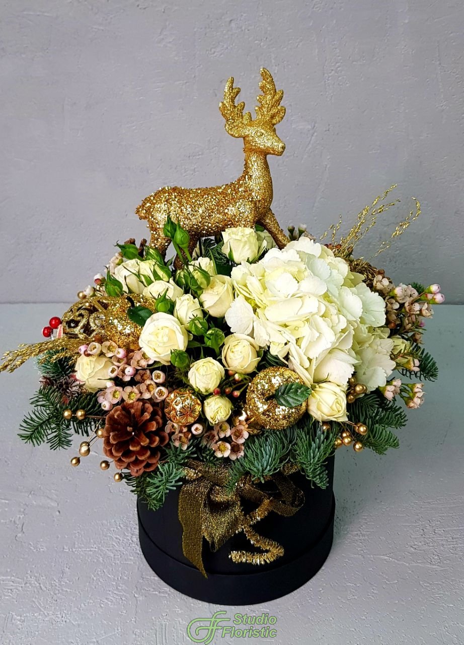 Гортензия (1шт.); Ваксфлауэр (1шт.); Роза кустовая (1шт.); Золотые тычинки (1шт.); Золотой шар маленький (2шт.); Золотой шар (1шт.); Шишки (2шт.); Золотые яблоки (1шт.); Золотой паникум (1шт.); Олень золотой (1шт.); Нобилис; Коробка; Оазис; Декор; Упаковка | 5999 | 9449 |