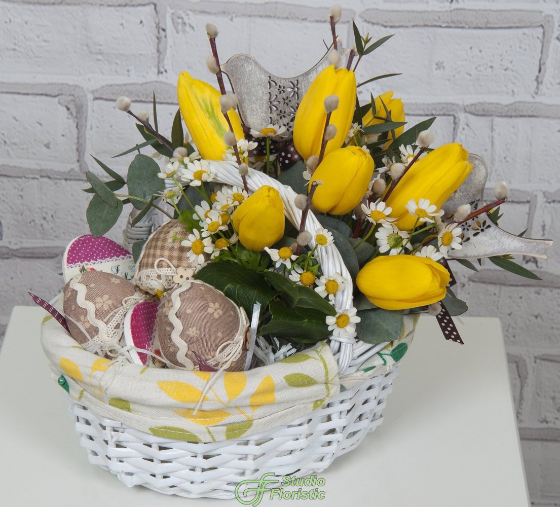 Композиция из Тюльпанов, Ромашек и Вербы в корзине «Весеннее пробуждение»