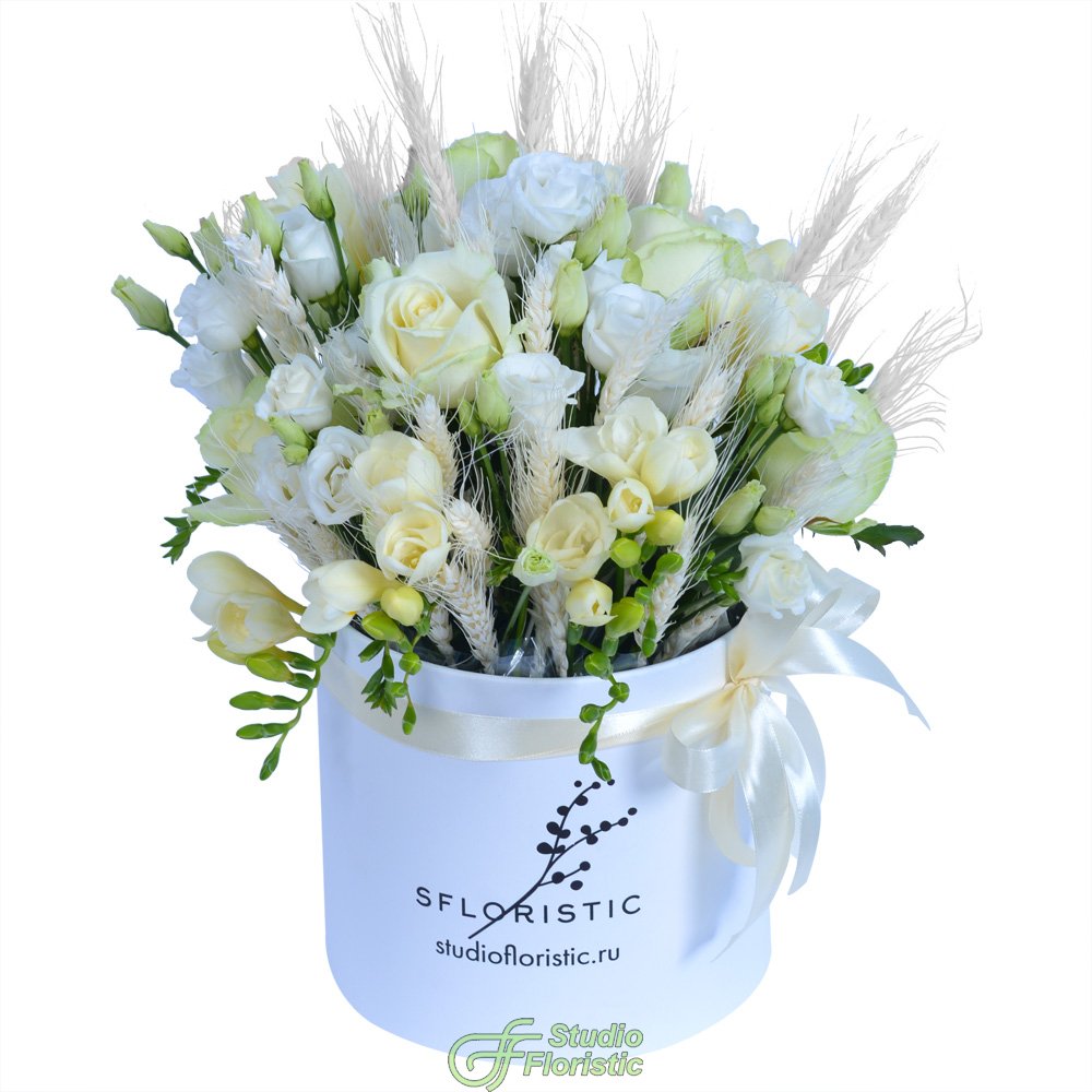 Эустома (11шт); Роза (11шт); Фрезия (23шт); Колосья пшеницы (1/2 пучка); Шляпная коробка | 8599 | 14199 |