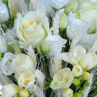 Эустома (9шт); Роза (9шт); Фрезия (19 шт); Колосья пшеницы (1/2 пучка); Шляпная коробка | 7399 | 11849 |