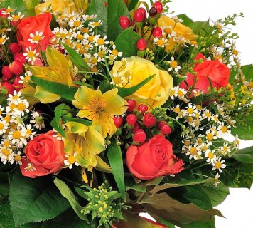Роза (9 шт.); Альстромерия (3 шт.); Гиперикум (2 шт.); Матрикария (3 шт.); Солидаго (2 шт.); Салал; Лента | 3399 | 5099 |