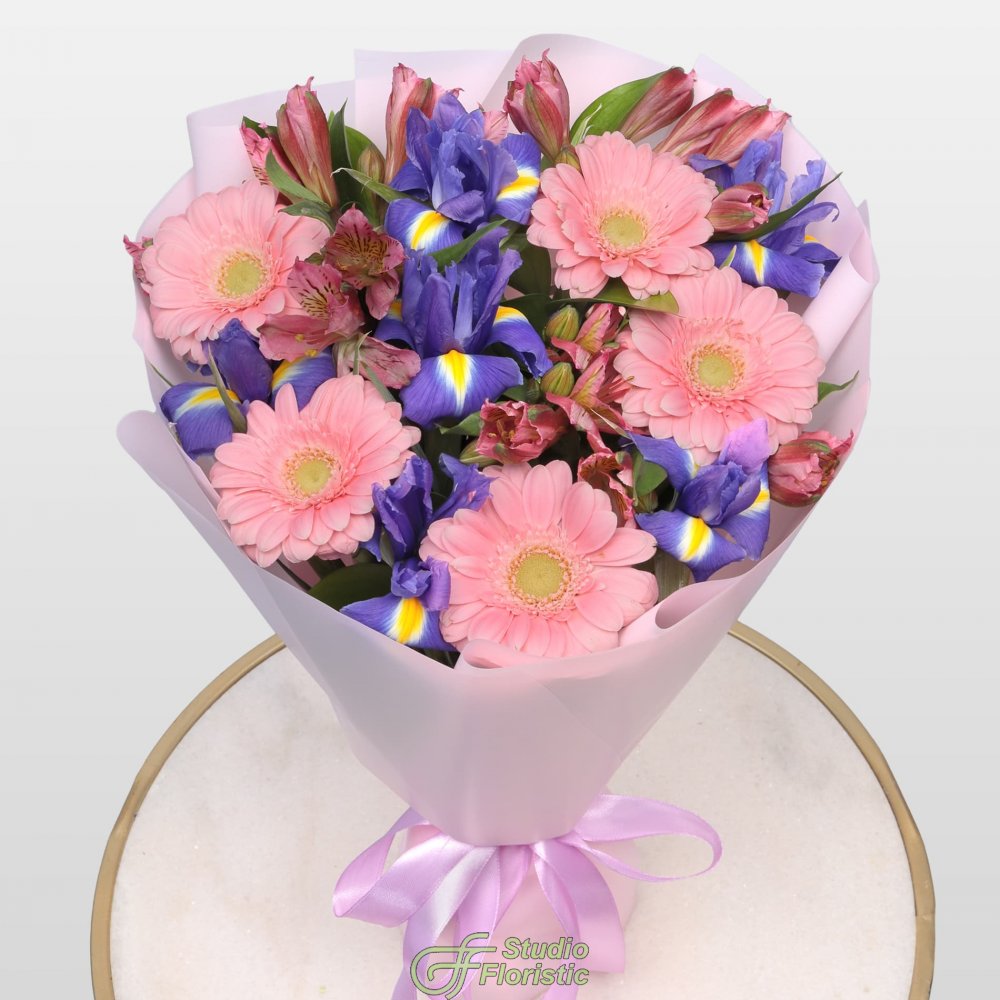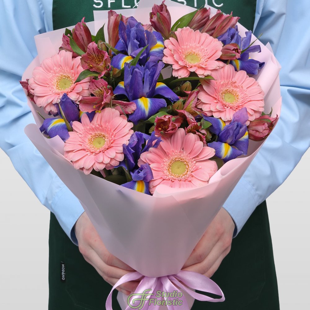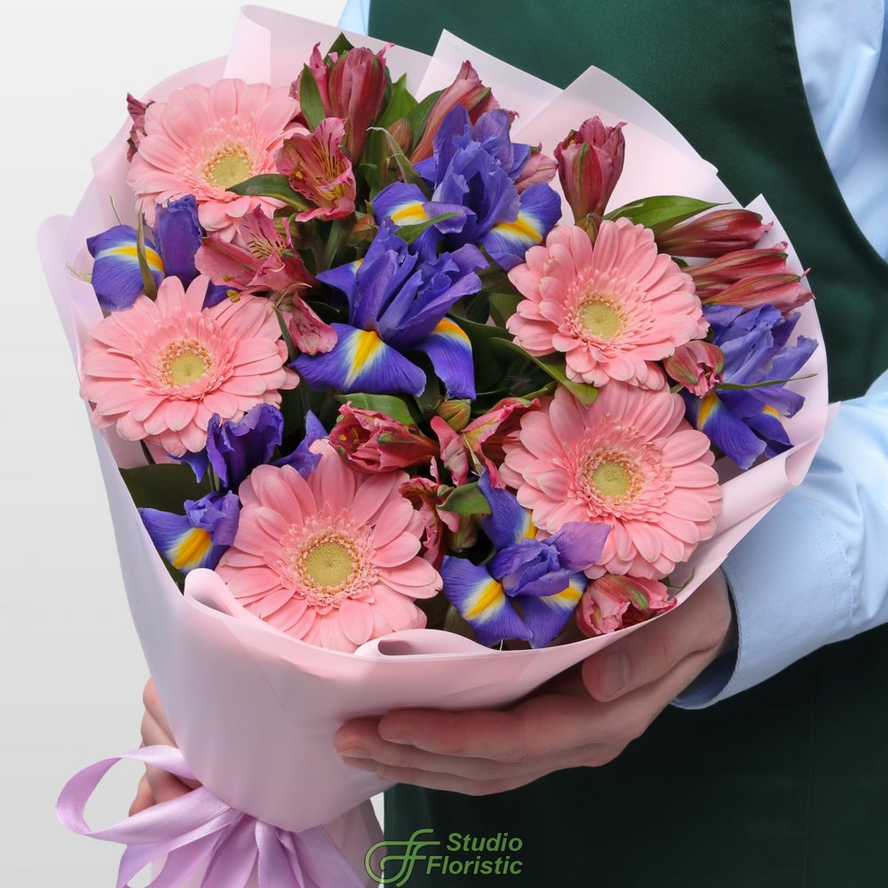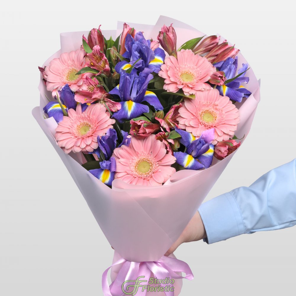 Гермини (5шт.); Ирис (7шт.); Альстромерия (5шт.); Зелень; Упаковка; Атласная лента | 2649 | 3849 |