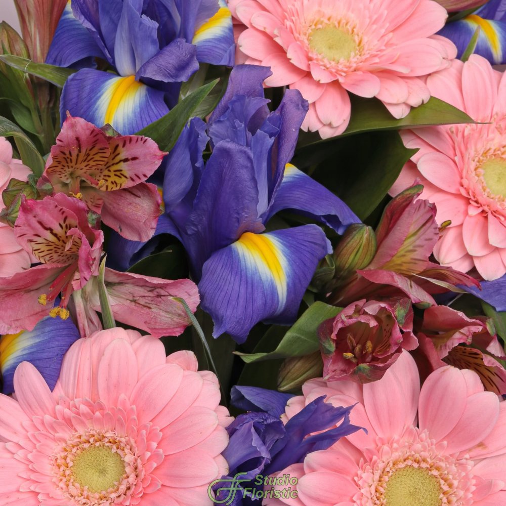 Гермини (7шт.); Ирис (9шт.); Альстромерия (7шт.); Зелень; Упаковка; Атласная лента | 3399 | 5099 |