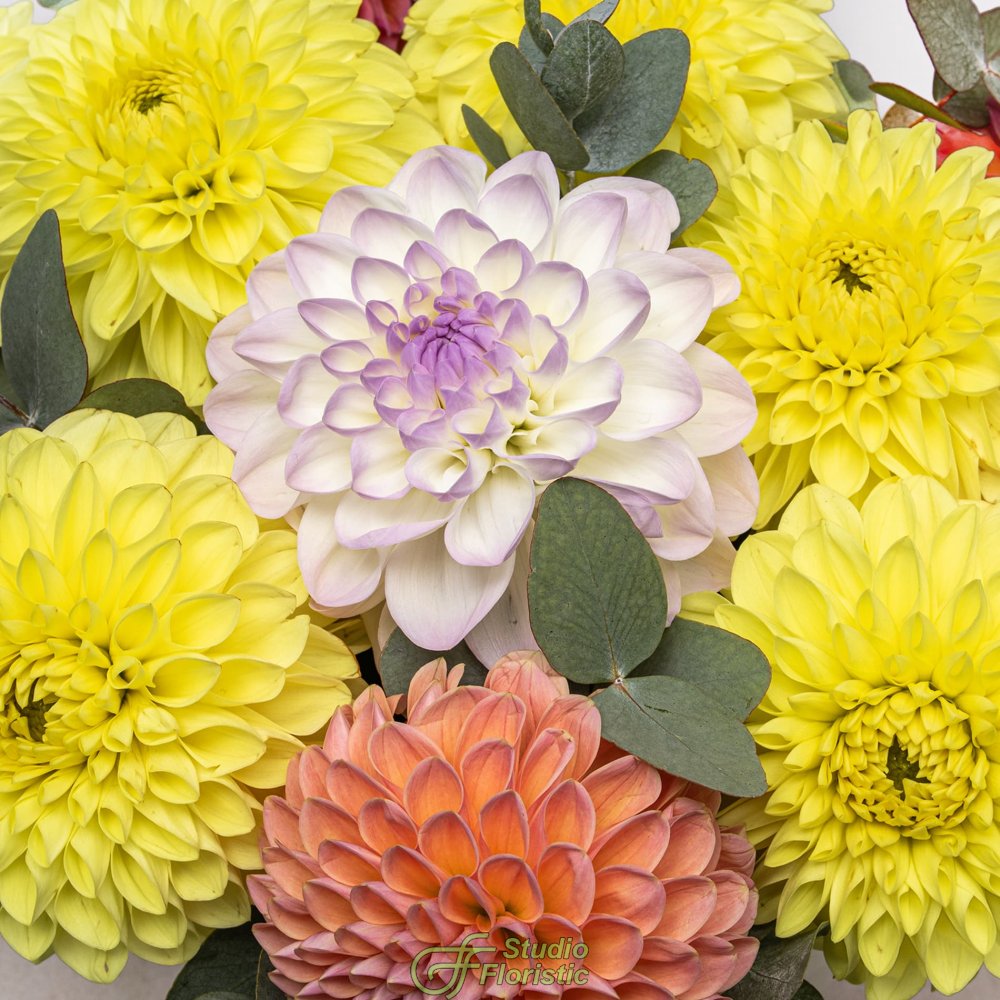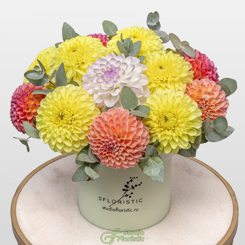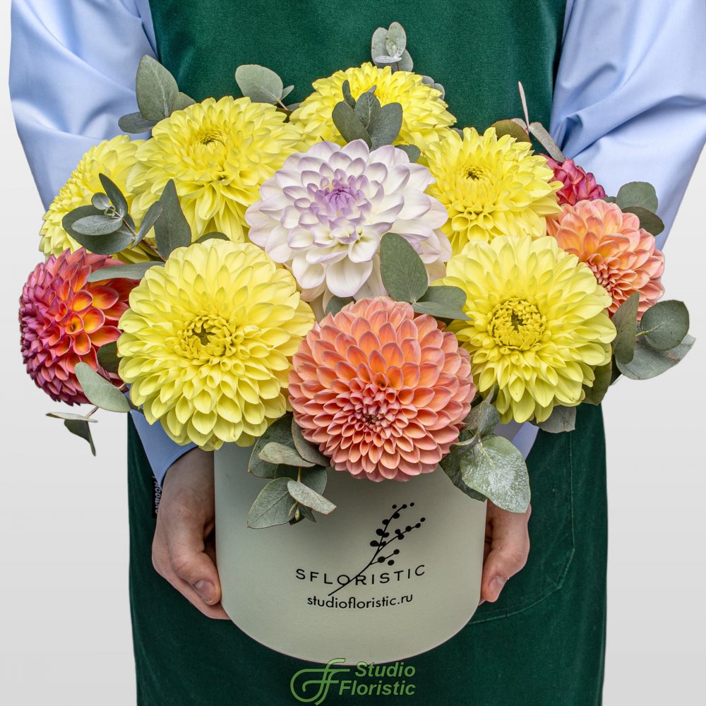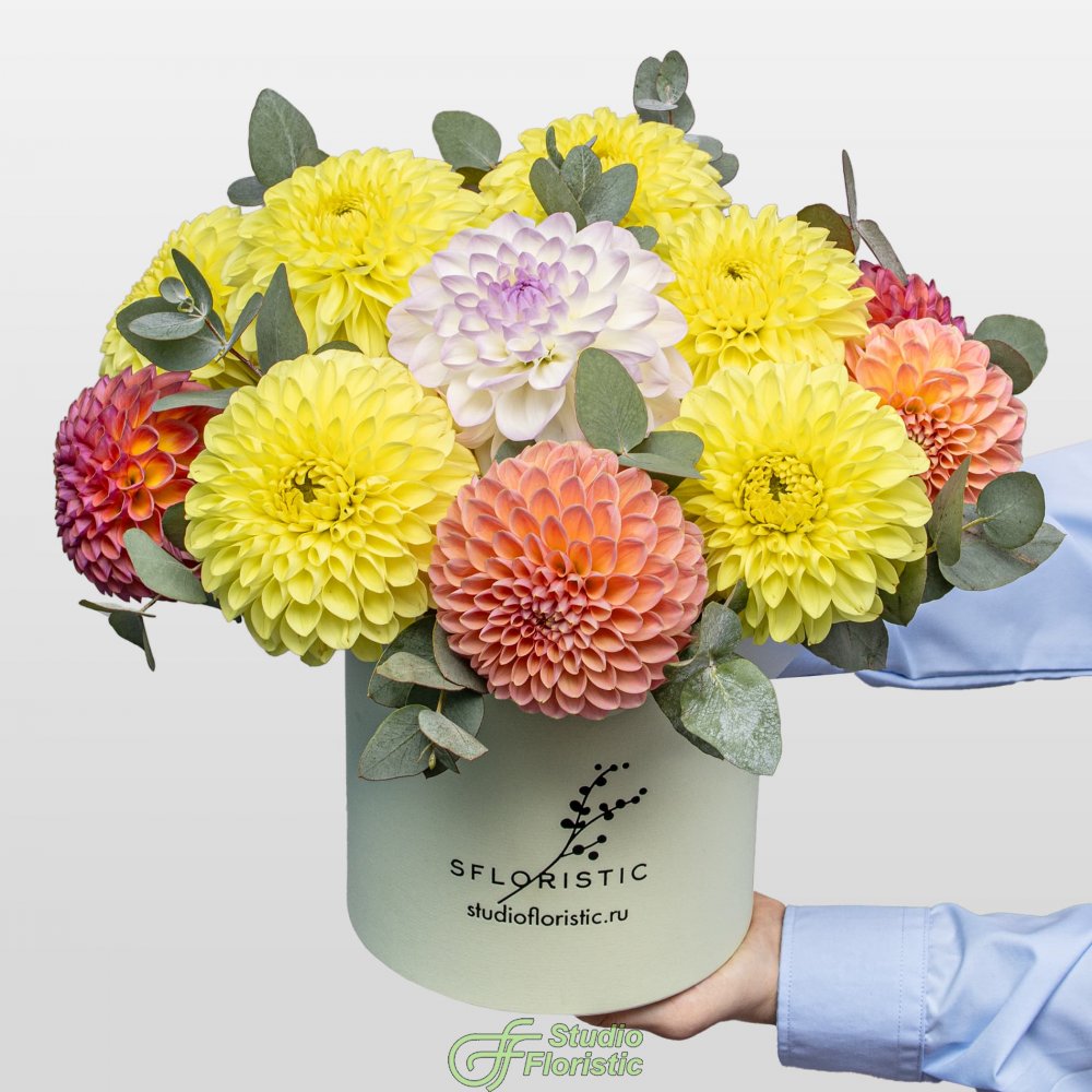 Композиция из Георгин и Эвкалипта в шляпной коробке «Солнечный Коктейль»