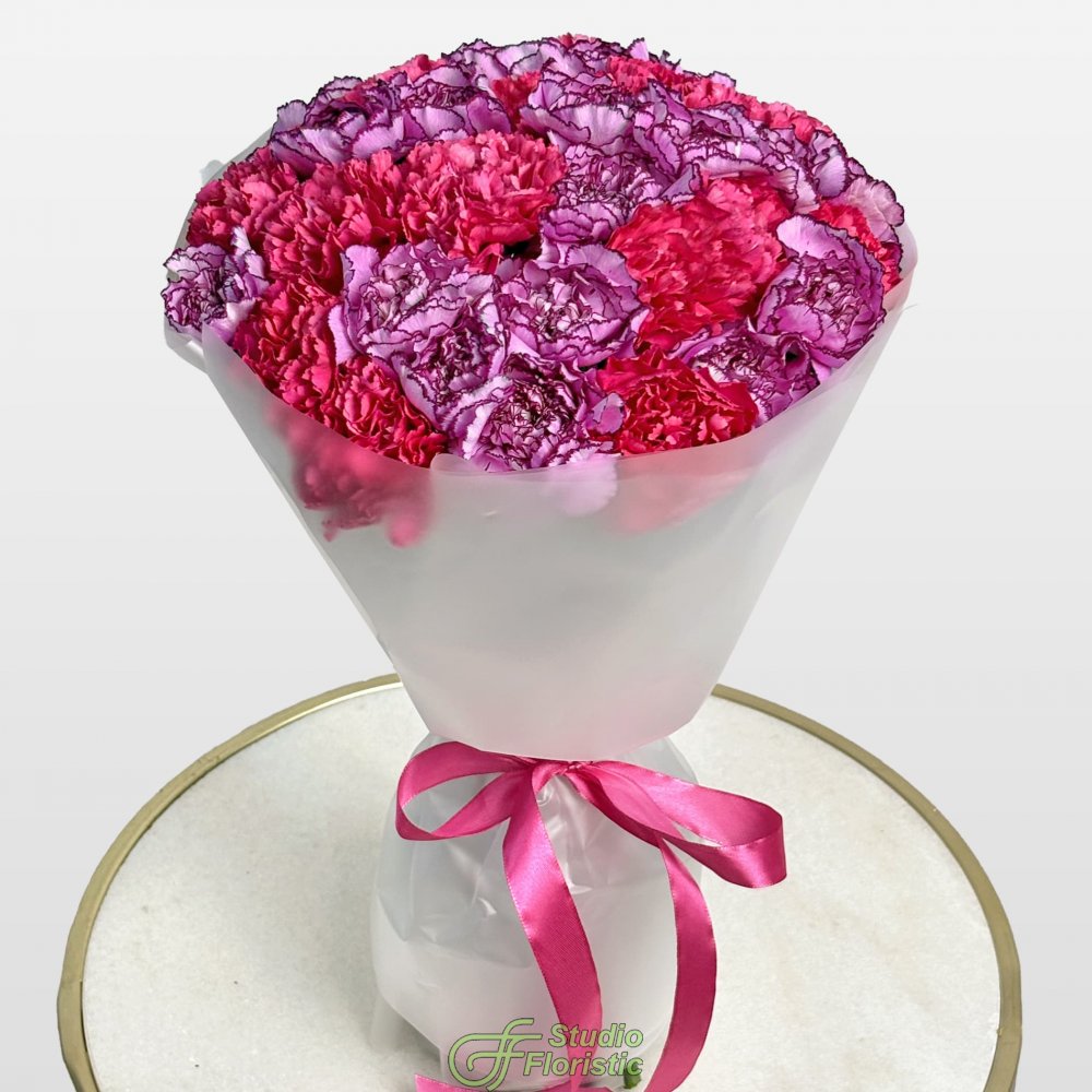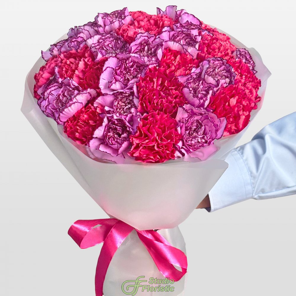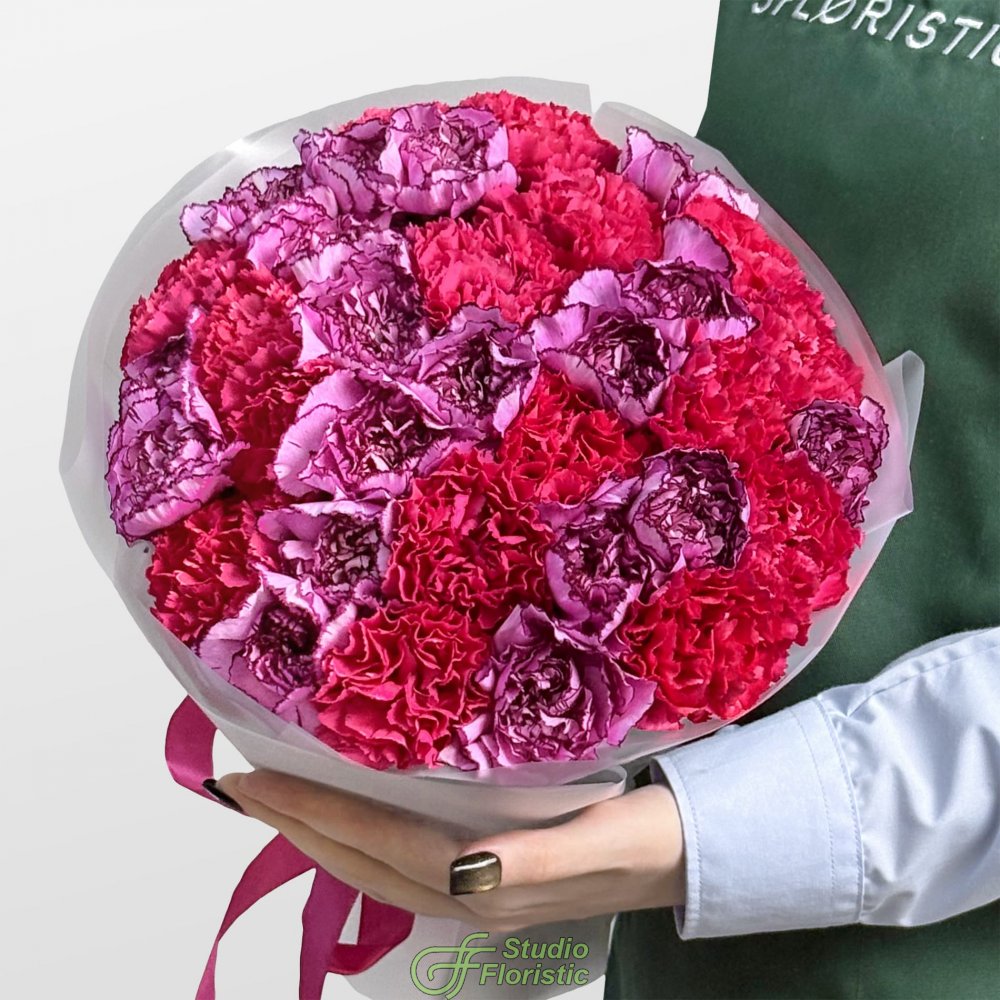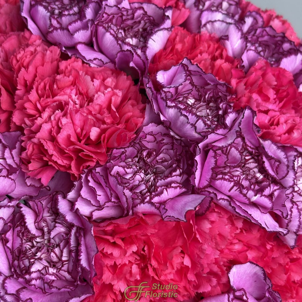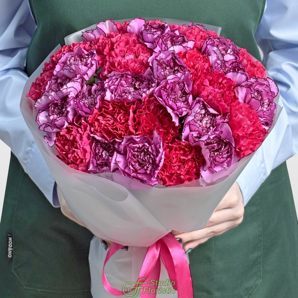 Букет из малиновых и фиолетовых Гвоздик 35 шт «Пламенное Сердце»