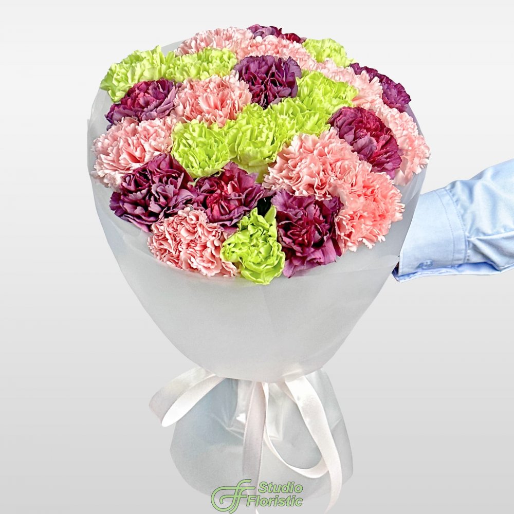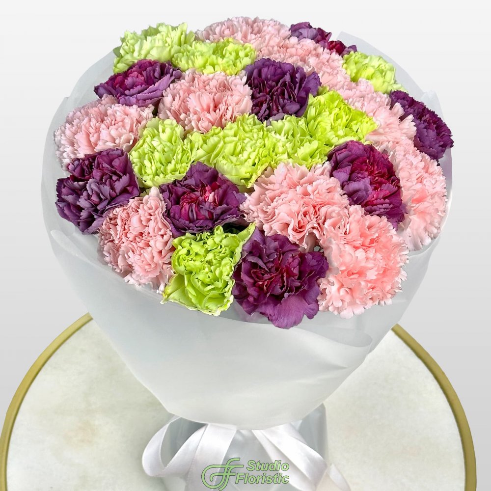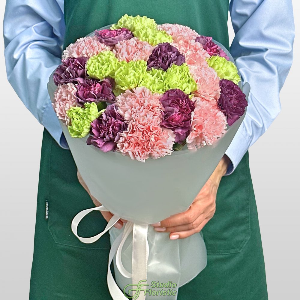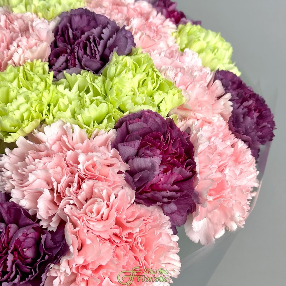 Букет из розовых, фиолетовых и зеленых Гвоздик 25 шт «Тайное Желание»