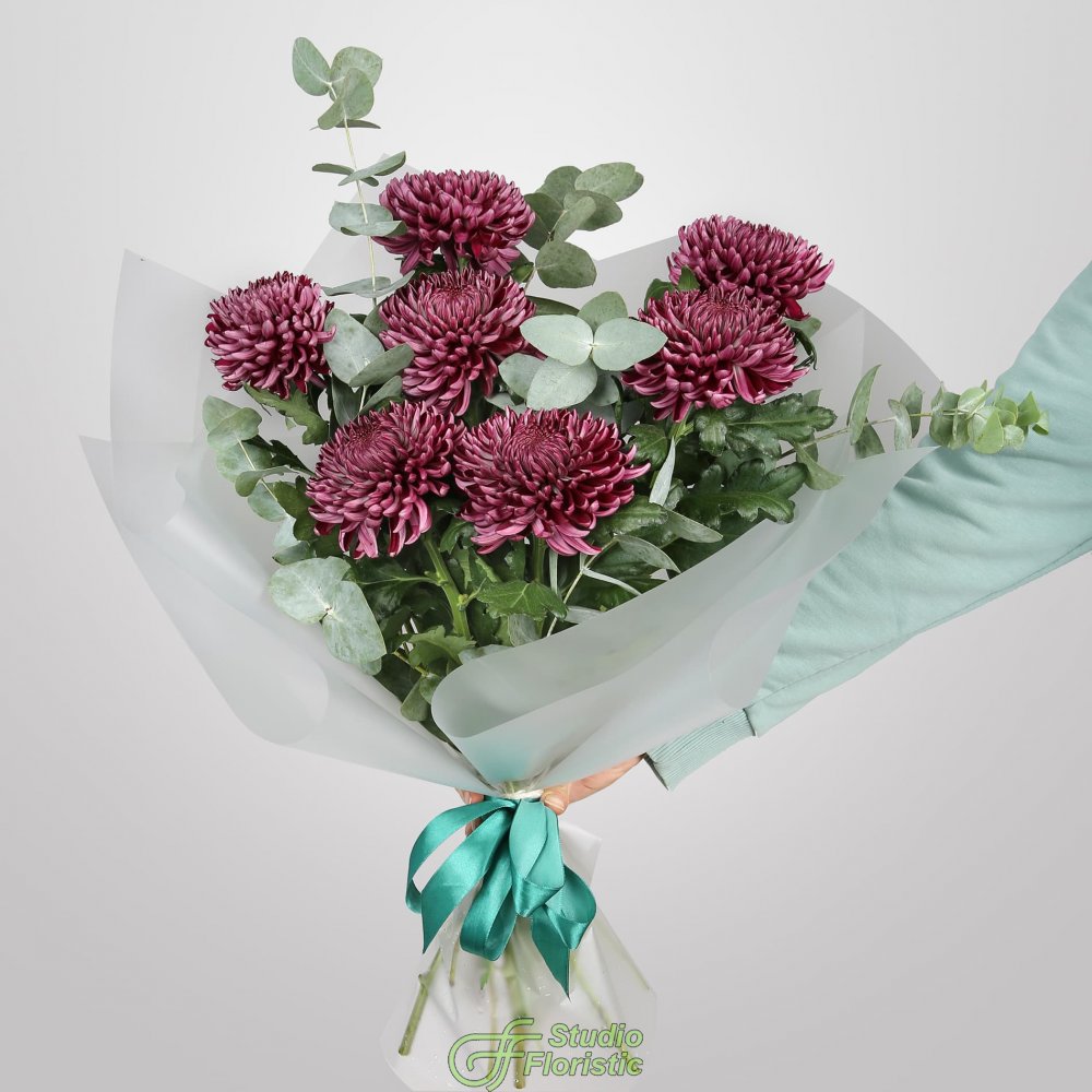 Хризантема бигуди (7шт.); Эвкалипт; Матовая пленка; Атласная лента | 5349 | |