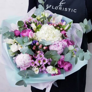 Гортензия (1шт.); Роза Мисти Баблс (3шт.); Пион (2шт.); Эустома (2шт.); Хризантема сантини (2шт.); Гиперикум (2шт.); Статица (2шт.); Фрезия (2шт.); Тюльпан (5шт.); Эвкалипт; Упаковка | 6749 | |