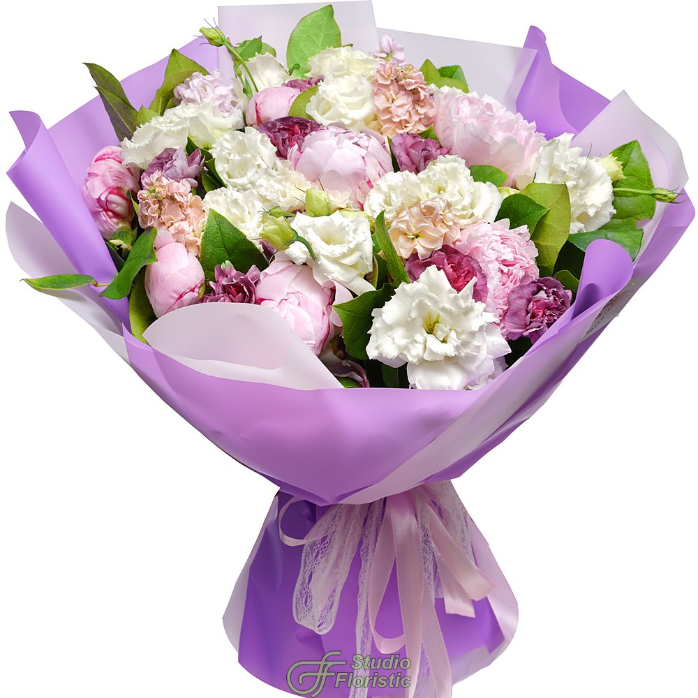 Букет из Пионов, Гвоздик, Маттиол и Лизиантуса «Рапунцель» (делюкс)