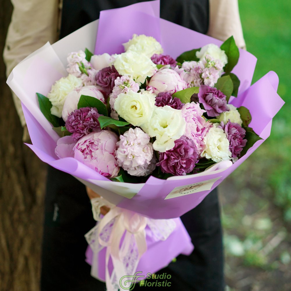 Букет из Пионов, Гвоздик, Маттиол и Лизиантуса «Рапунцель» (стандартный)
