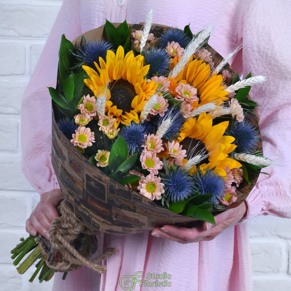 Букет из Подсолнухов, Хризантем и Эрингиума «Милашка»