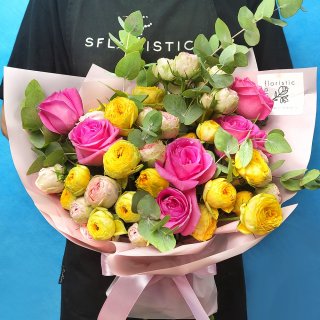 Роза кустовая пионовидная (7шт.); Эвкалипт; Матовая плёнка; Атласная лента | 3349 | 4999 |