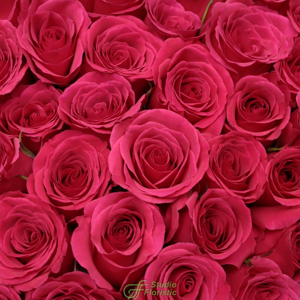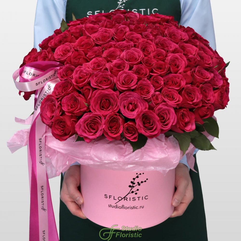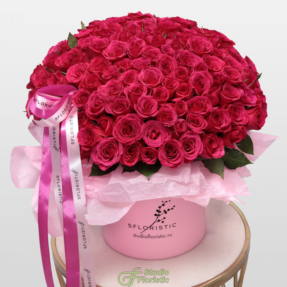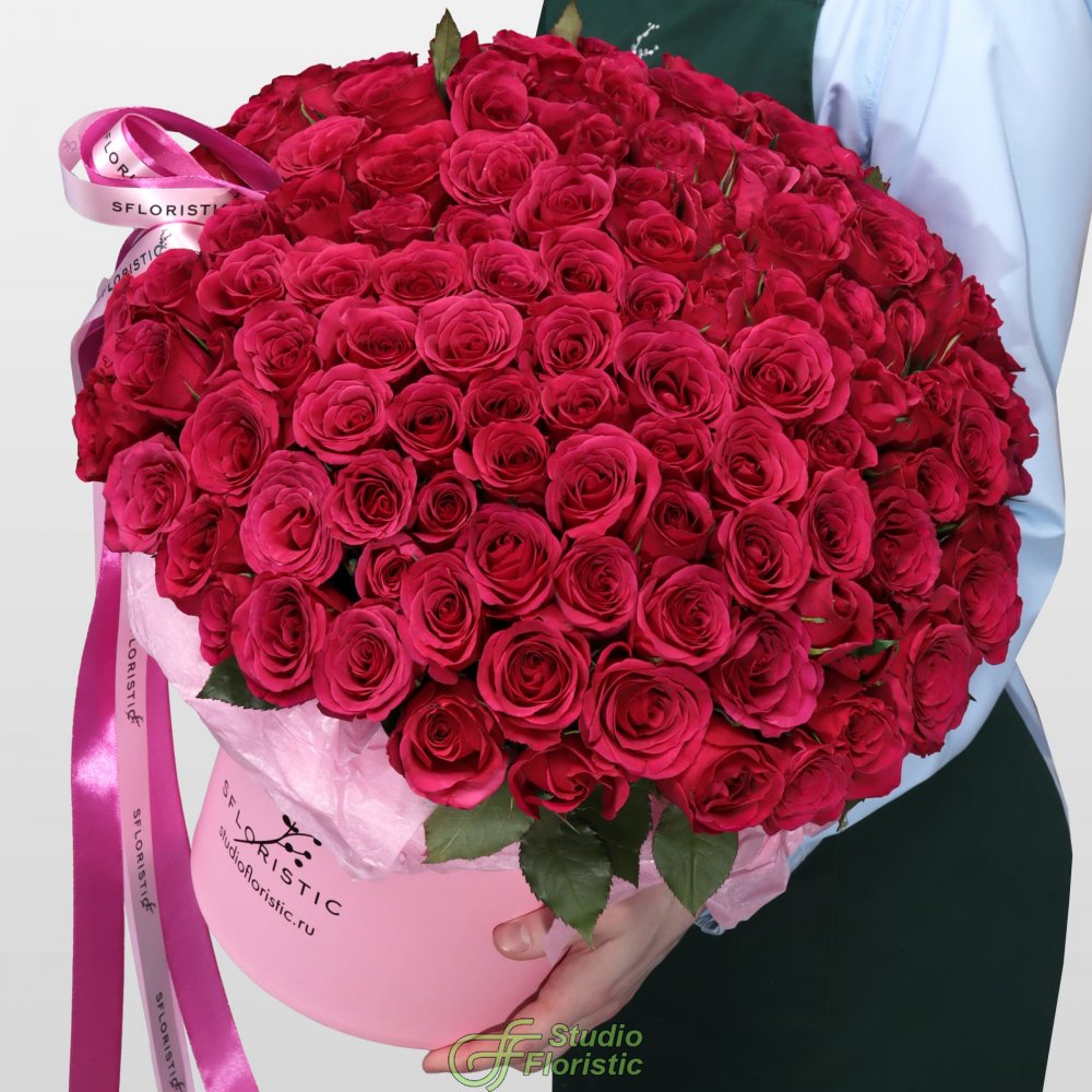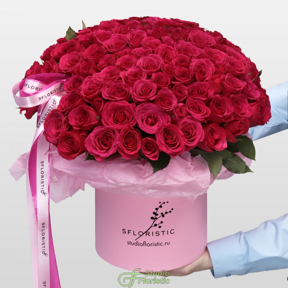 Композиция из Малиновых Роз Кения 101 шт в шляпной коробке «Бархатный сезон»