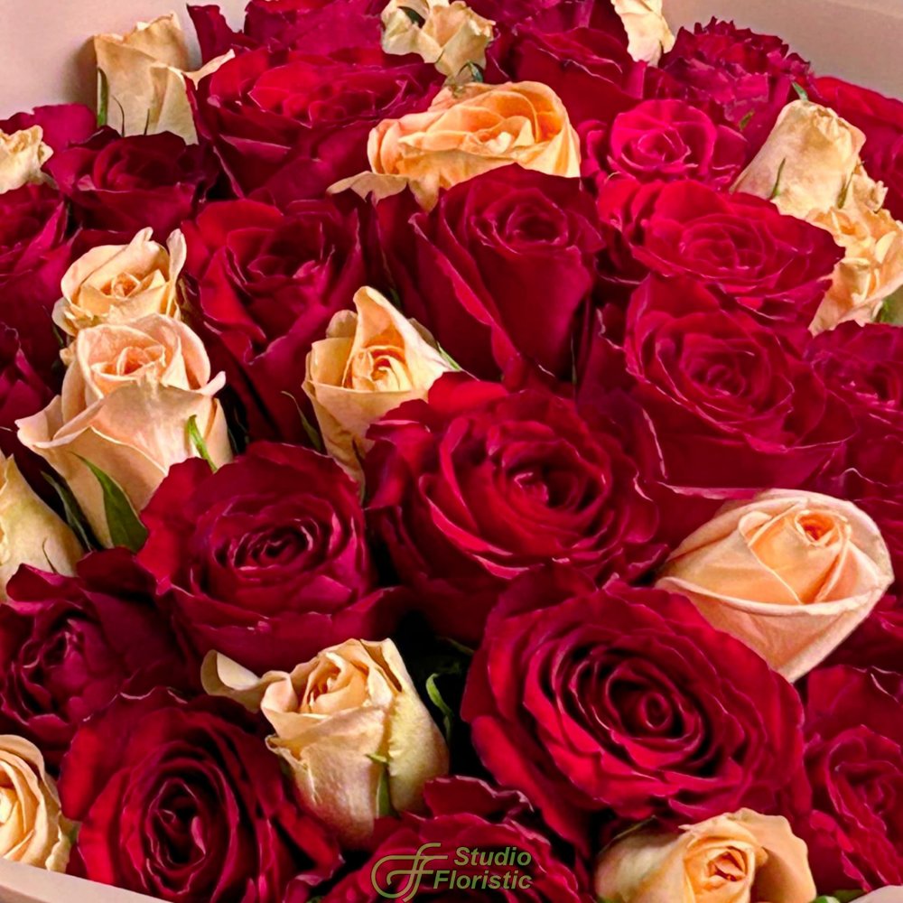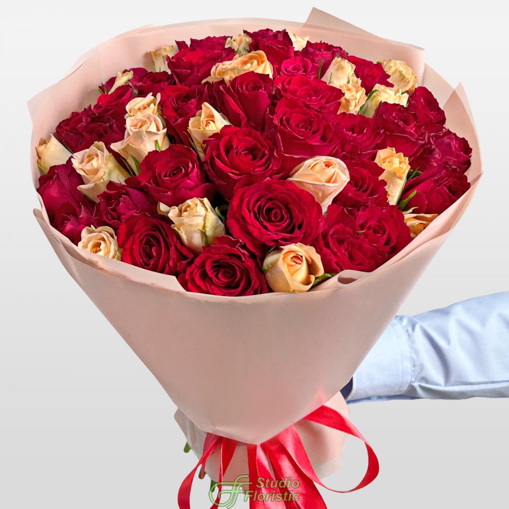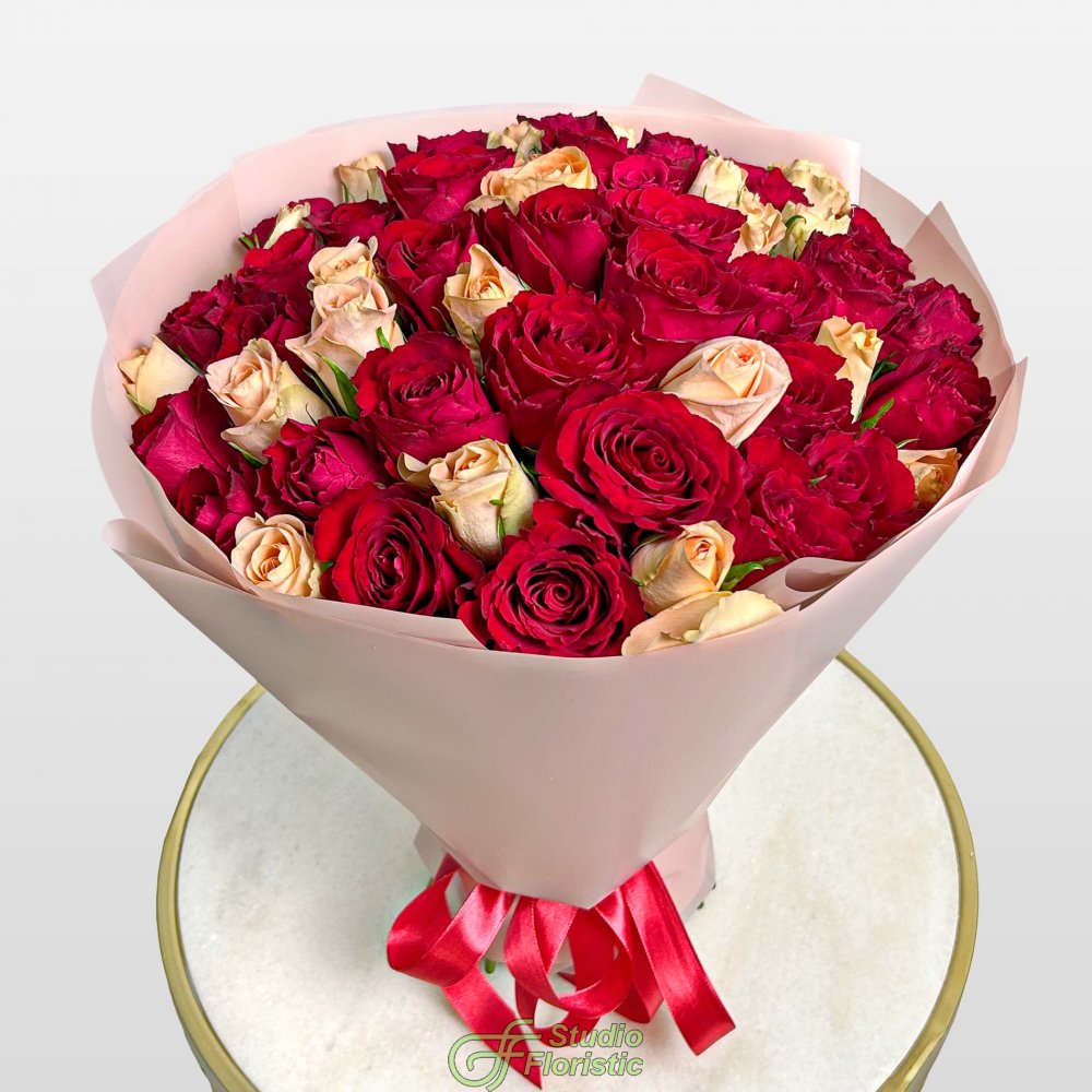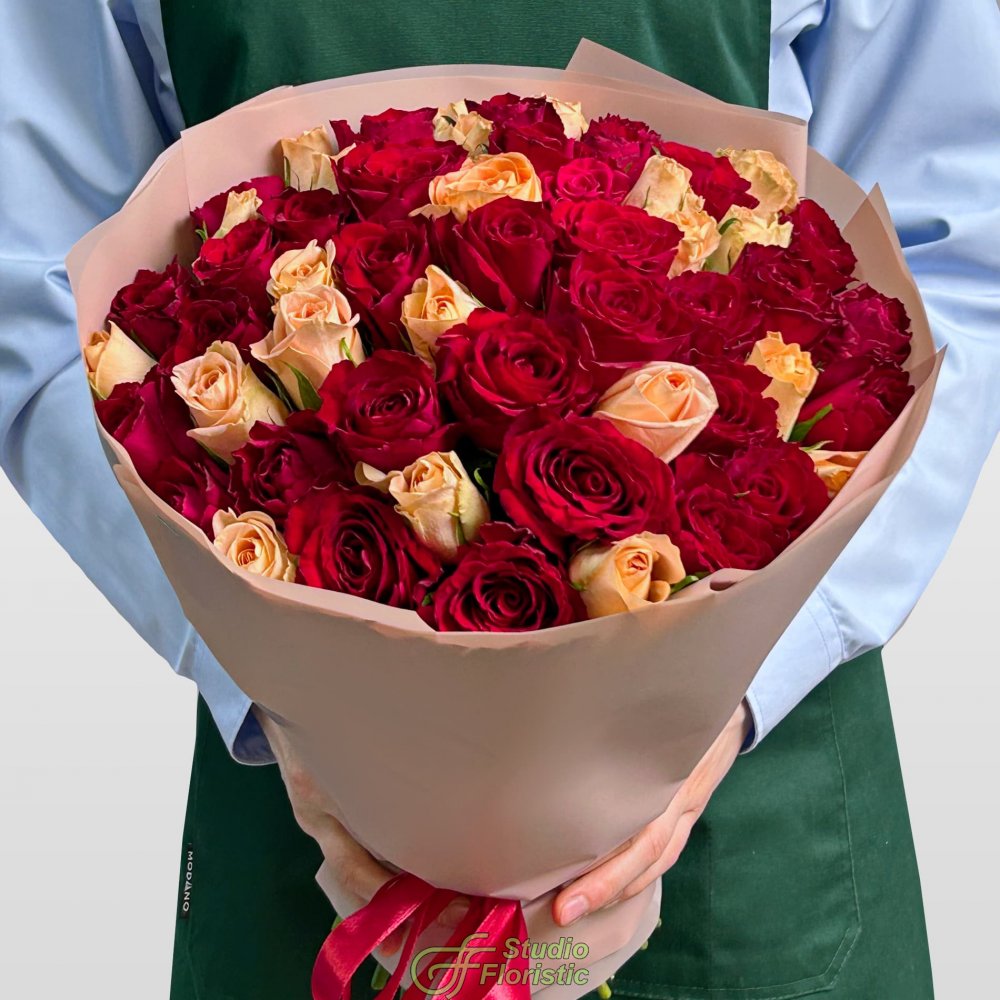 Букет из малиновых и кремовых Роз Кения 40 см 51 шт «Краски Заката»