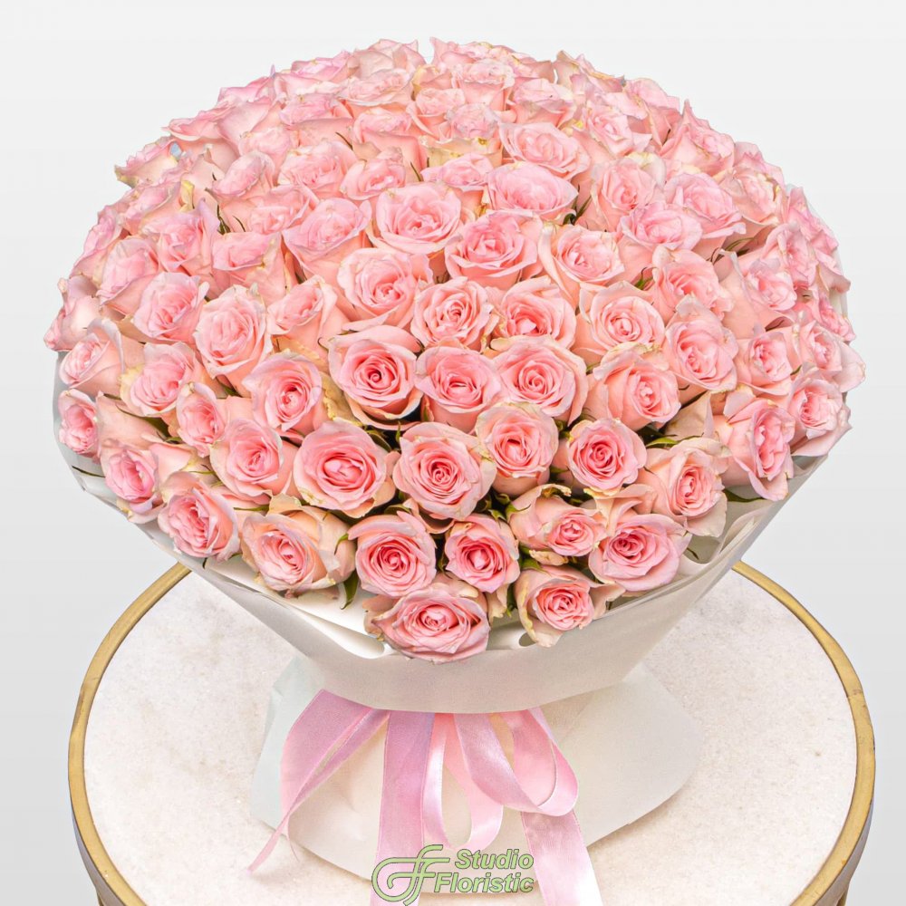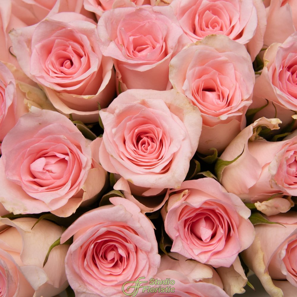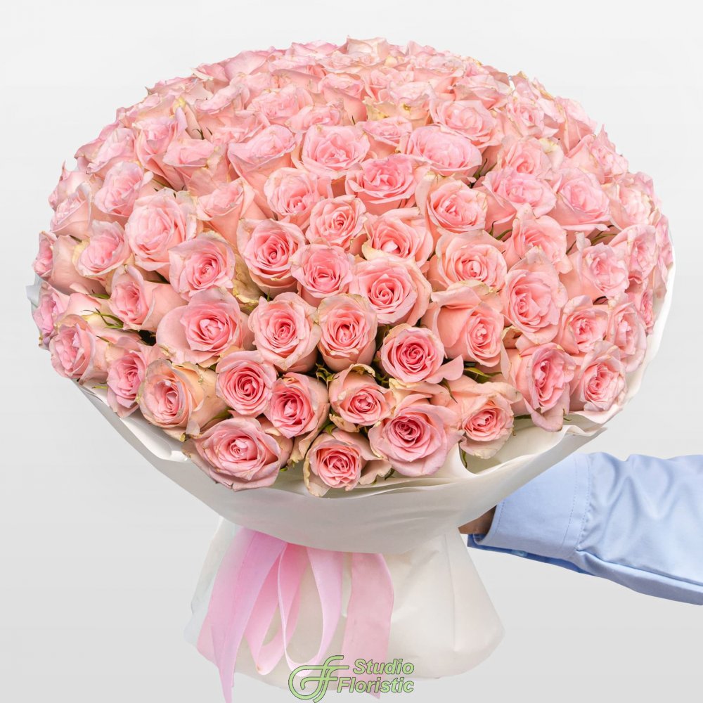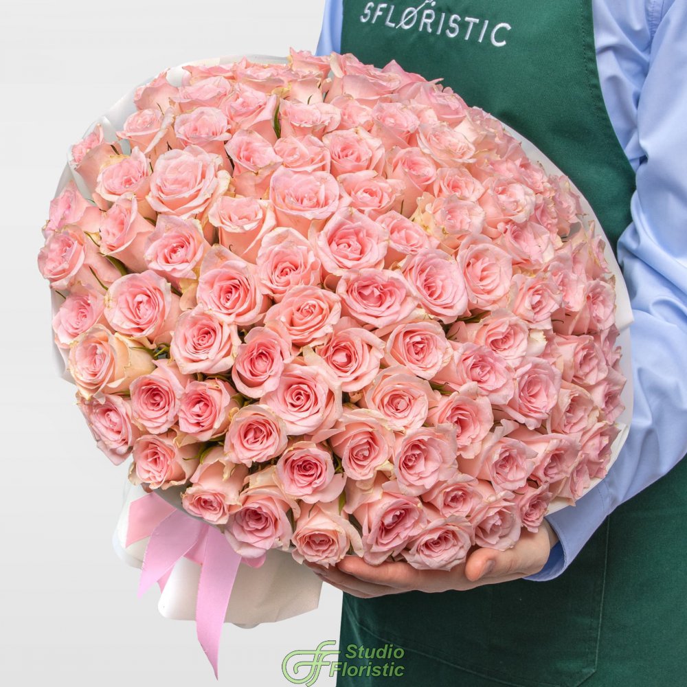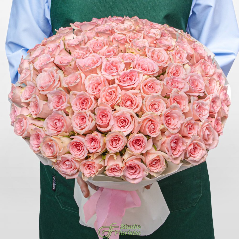 Букет нежно-розовых Роз Кения 40 см 101 шт «Рассветная Дымка»