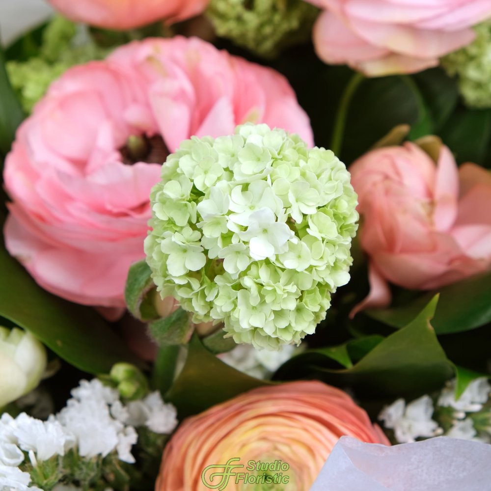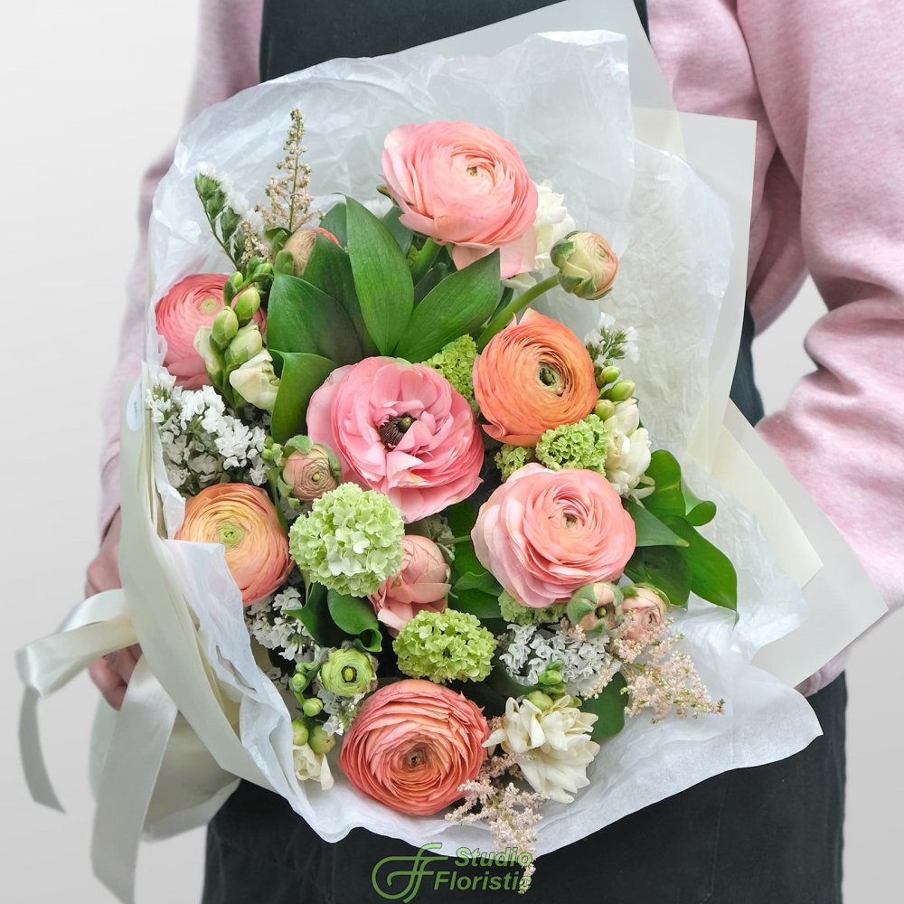 Ранункулюс (7шт.); Вибурнум (3шт.); Фрезия (5шт.); Статица (2шт.); Астильба (3шт.); Писташ; Рускус; Тишью; Упаковка; Лента | 5449 | |