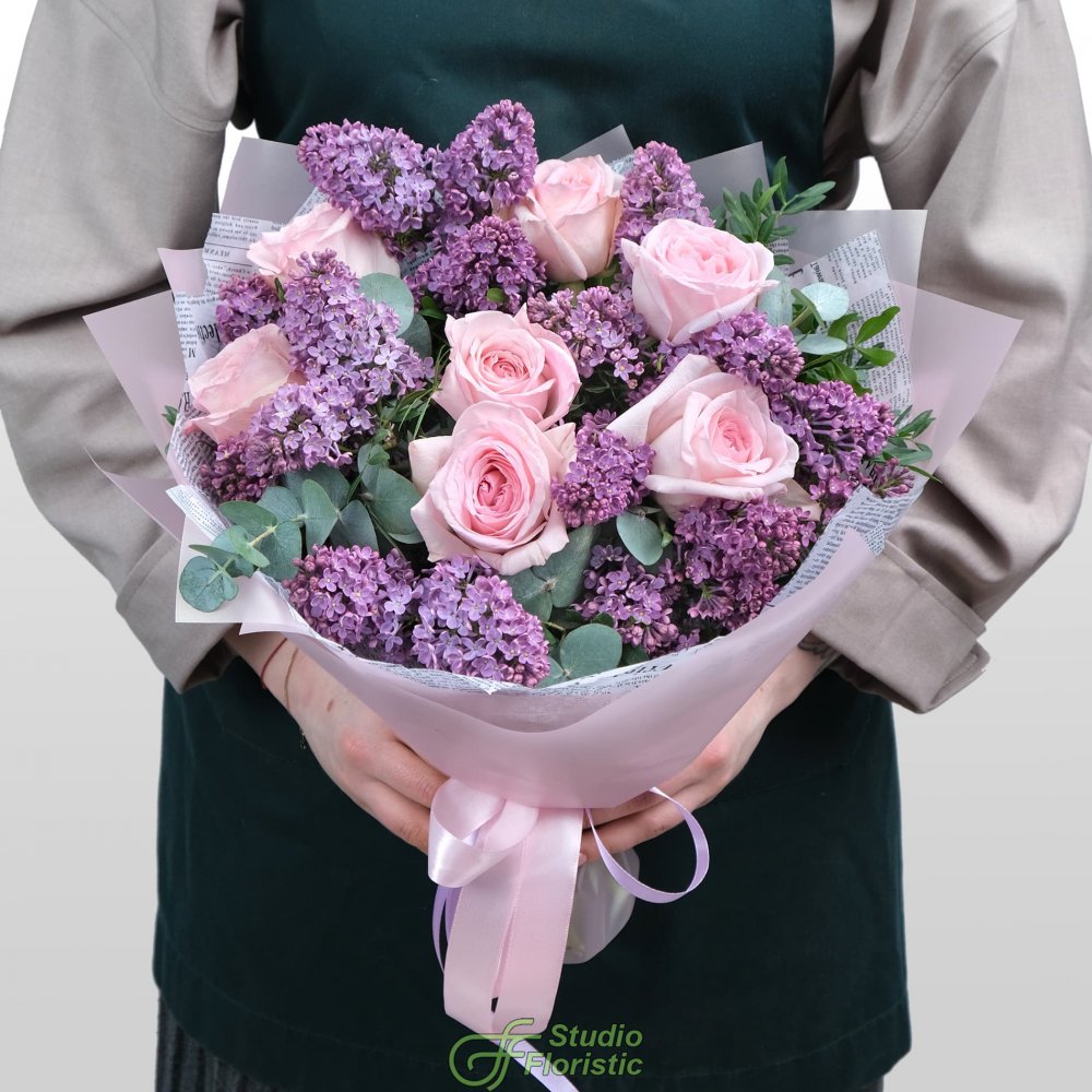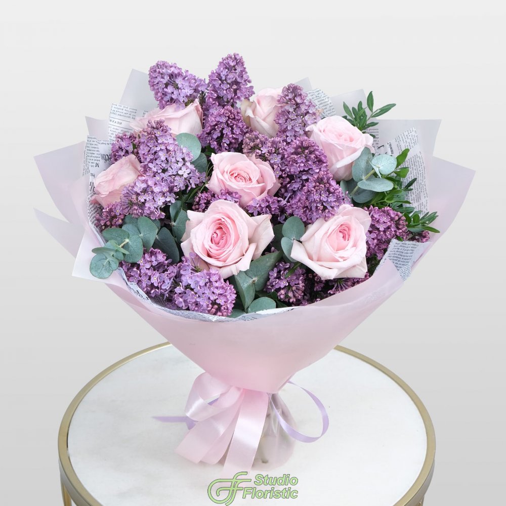Букет из Роз Пинк Охара и Сирени «Нежный рассвет»