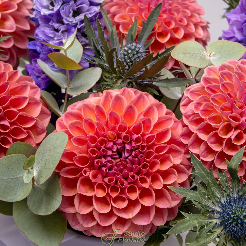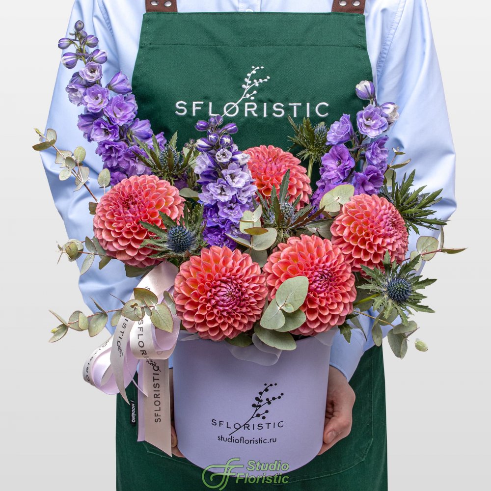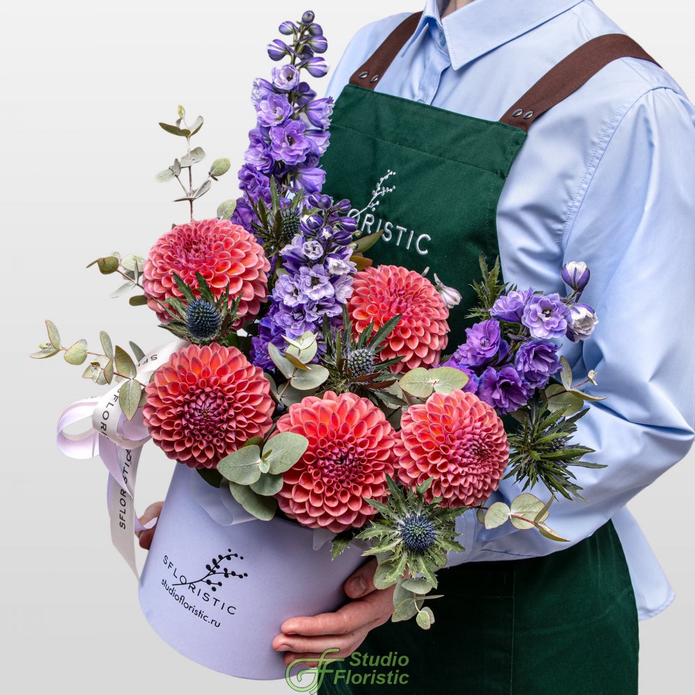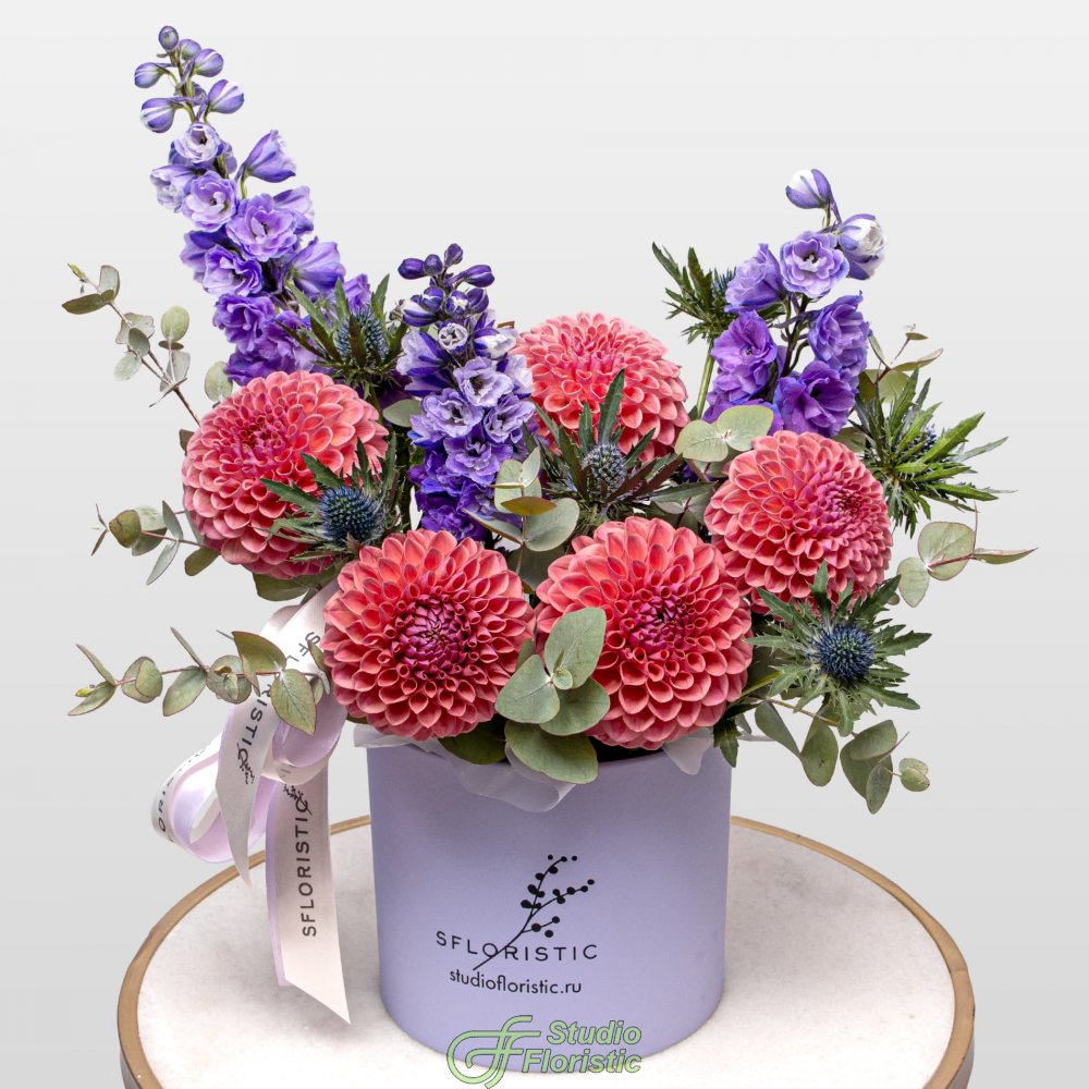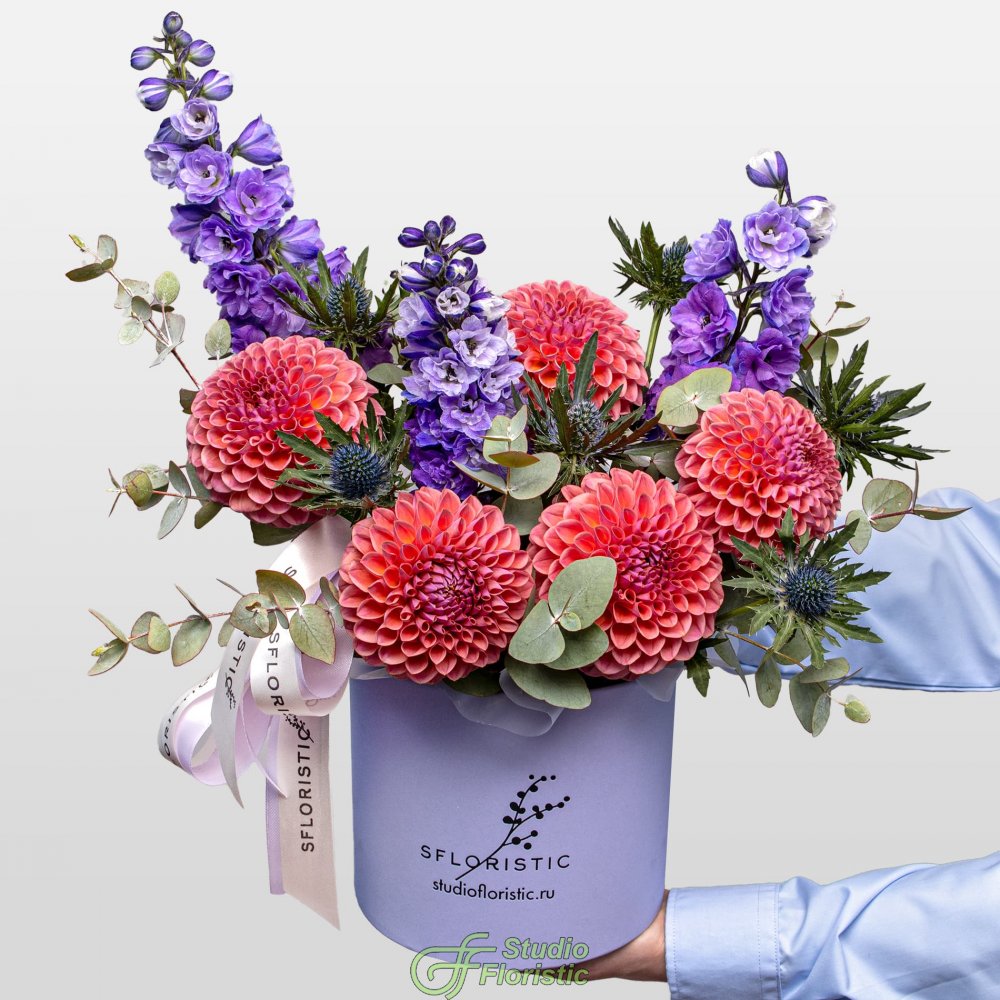 Георгин (3шт.); Дельфиниум (2шт.); Эрингиум (2шт.); Эвкалипт; Упаковка; Шляпная коробка; Атласная лента | 3349 | 5399 |