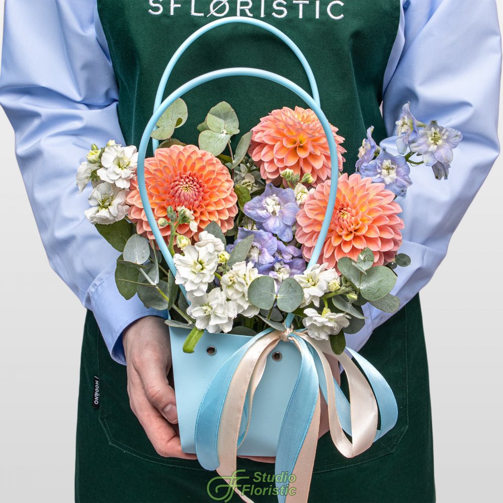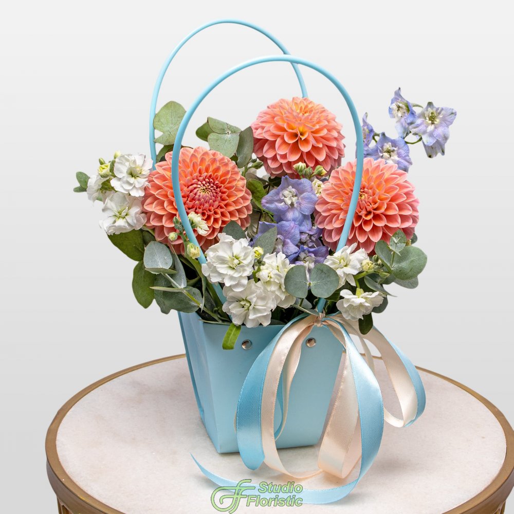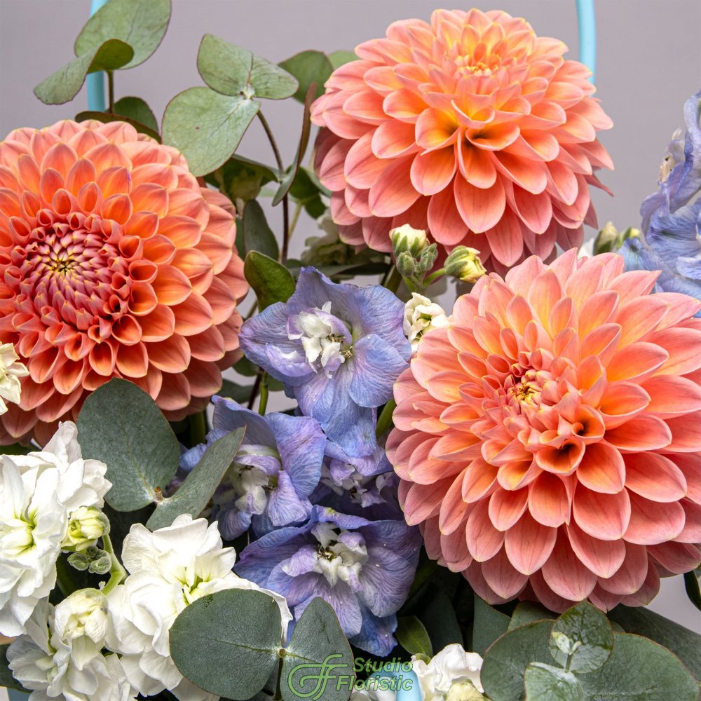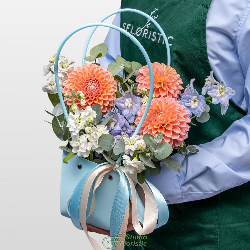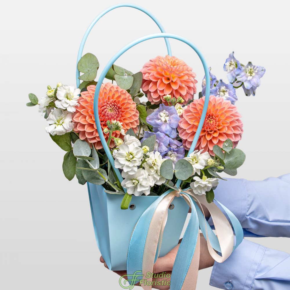 Георгин (5шт.); Дельфиниум (3шт.); Маттиола (3шт.); Эвкалипт; Сумочка; Атласная лента | 4599 | 7399 |