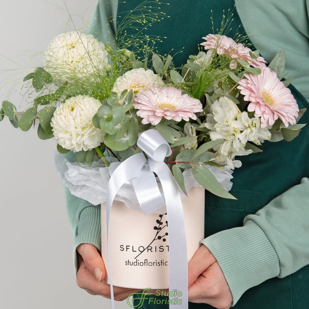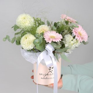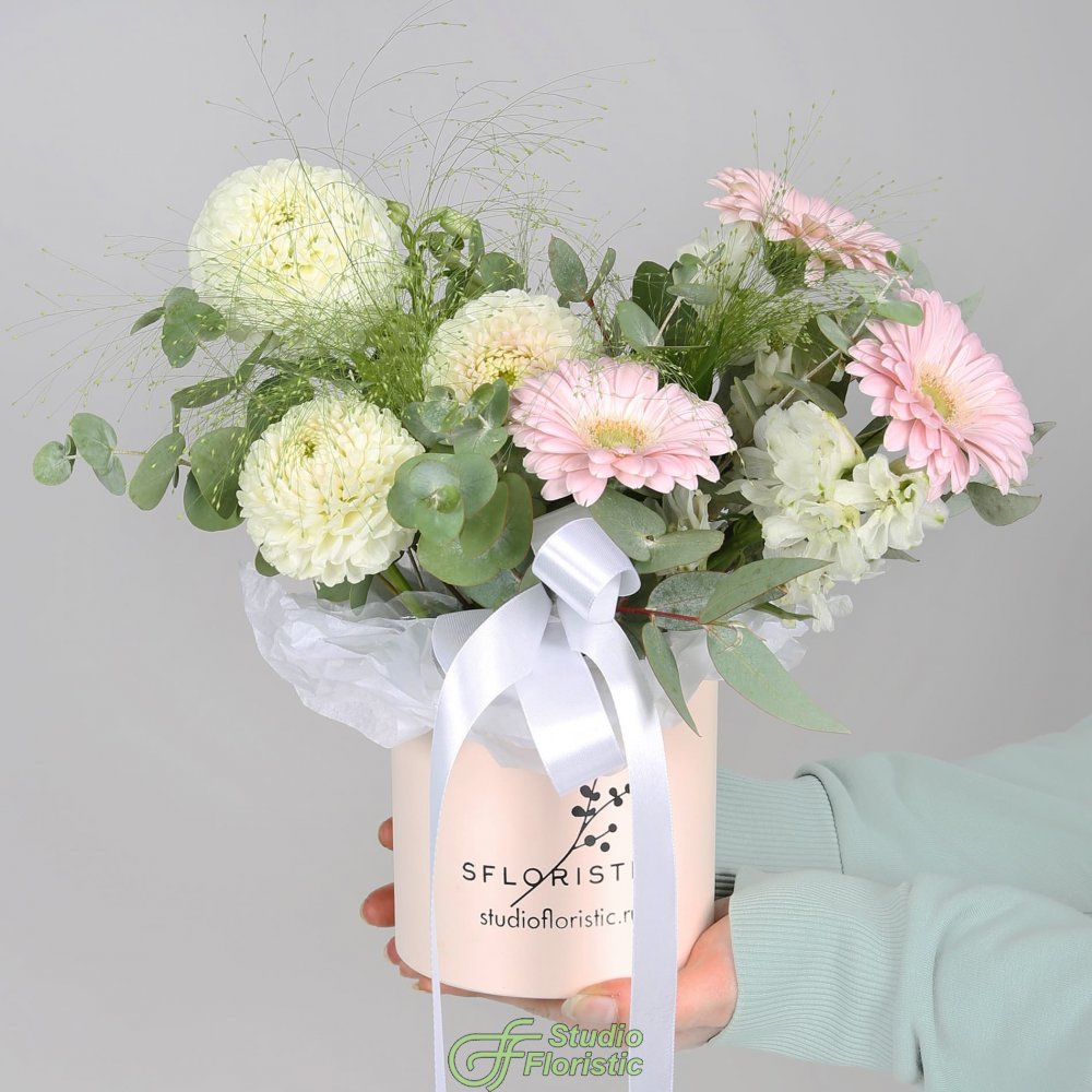 Композиция из Георгин и Гермини в шляпной коробке «Любовь в Цветах»
