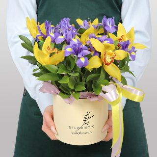 Орхидея Цимбидиум (9шт.); Ирисы (14шт.); Рускус; Шляпная коробка; Атласная лента | 4049 | 6299 |
