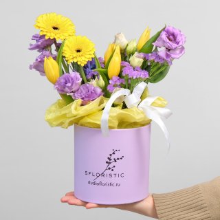 Гермини (4шт.); Статица (2шт.); Эустома (2шт.); Тюльпаны (9шт.); Гиацинт (2шт.); Аквабокс; Коробка; Атласная лента | 6349 | 10149 |