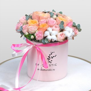 Розы кустовые (5шт.); Розы пионовидные (9шт.); Гиперикум (4шт.); Эвкалипт (1 ветка); Оазис; Хлопок (4шт.); Коробка шляпная | 7049 | 11299 |