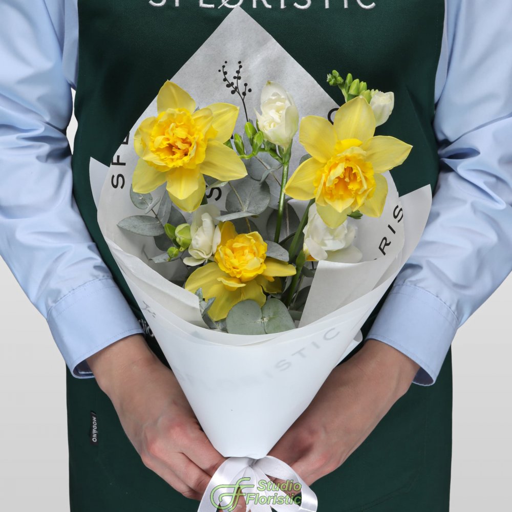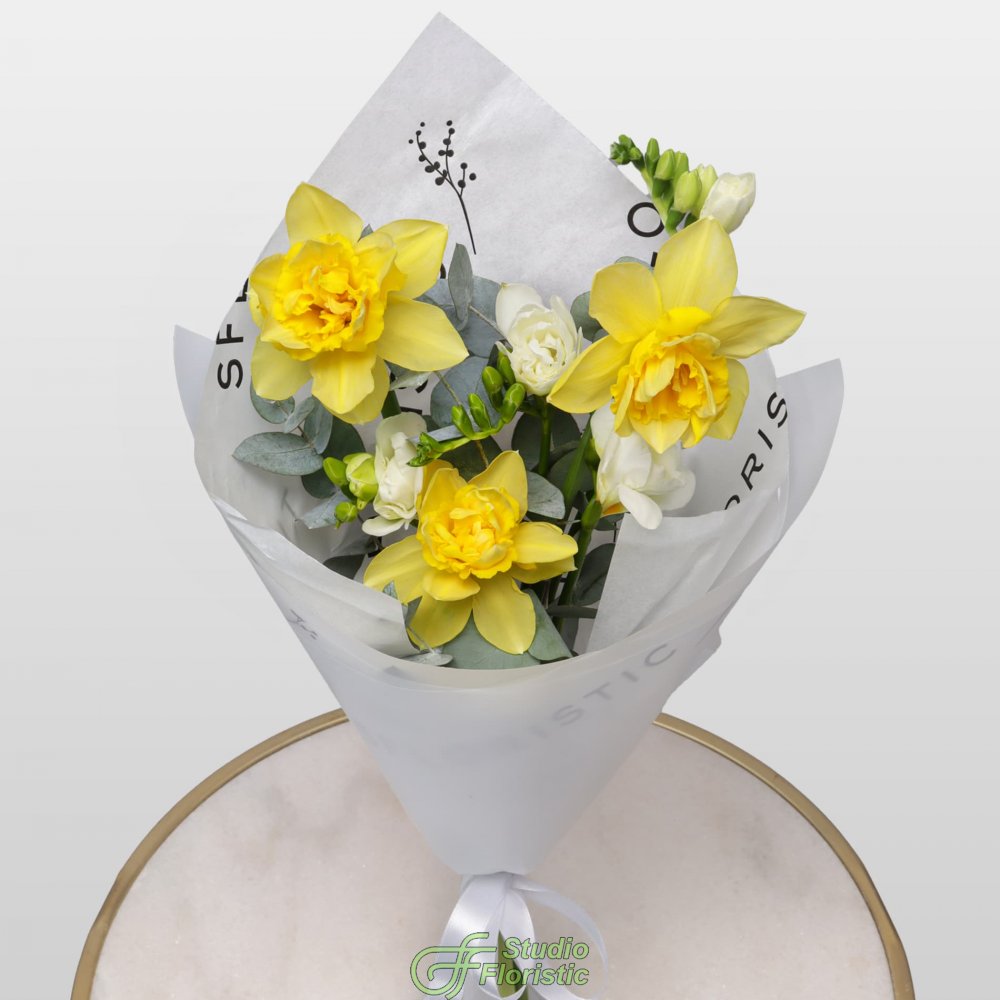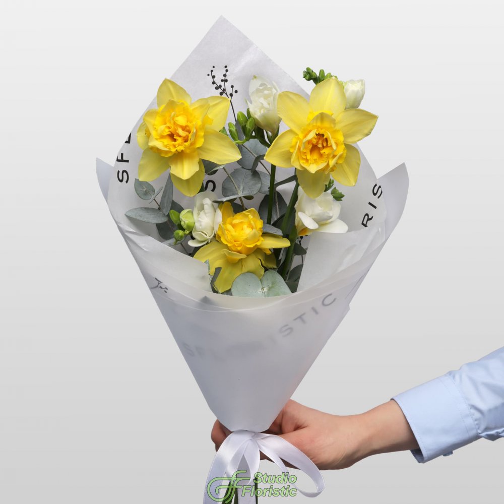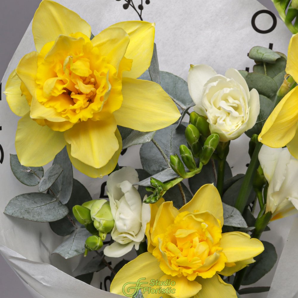 Нарцисс (3шт.); Фрезия (4шт.); Эвкалипт; Упаковка; Атласная лента | 2049 | 3299 |