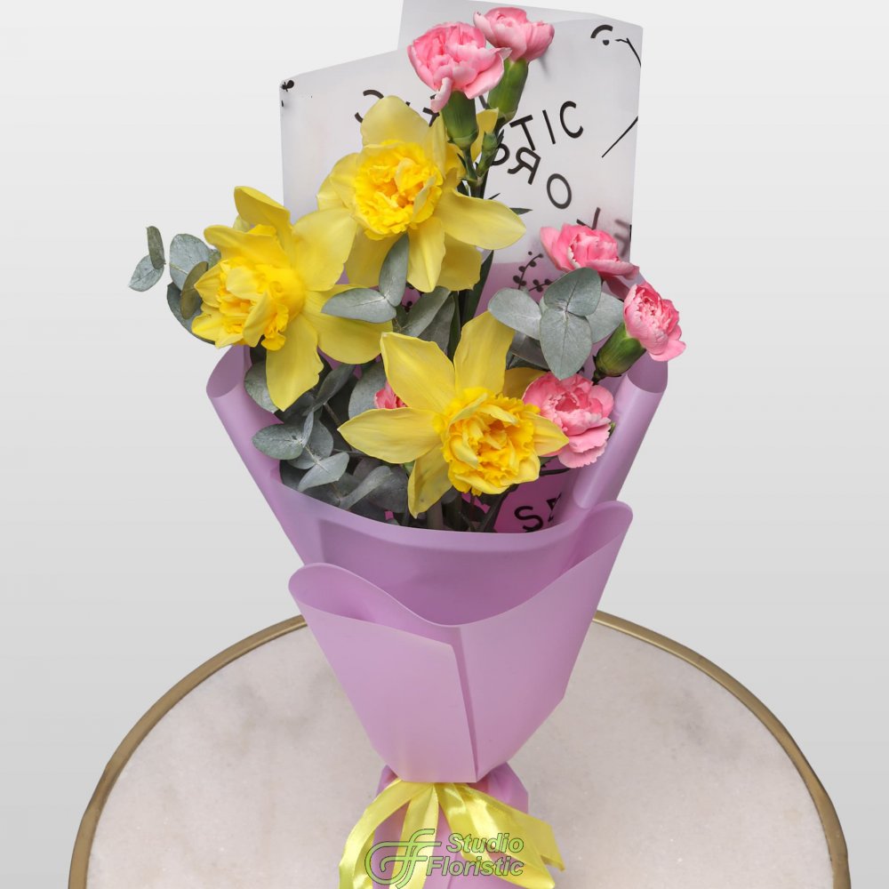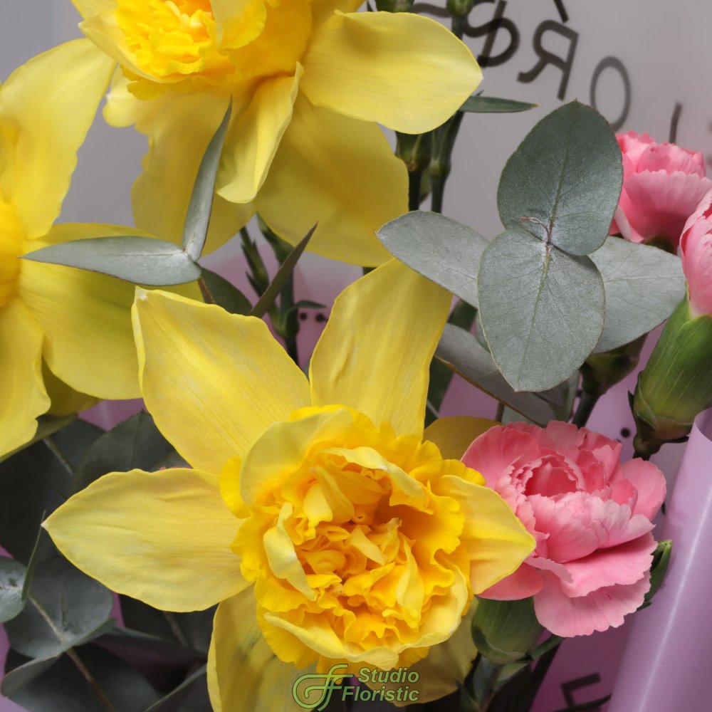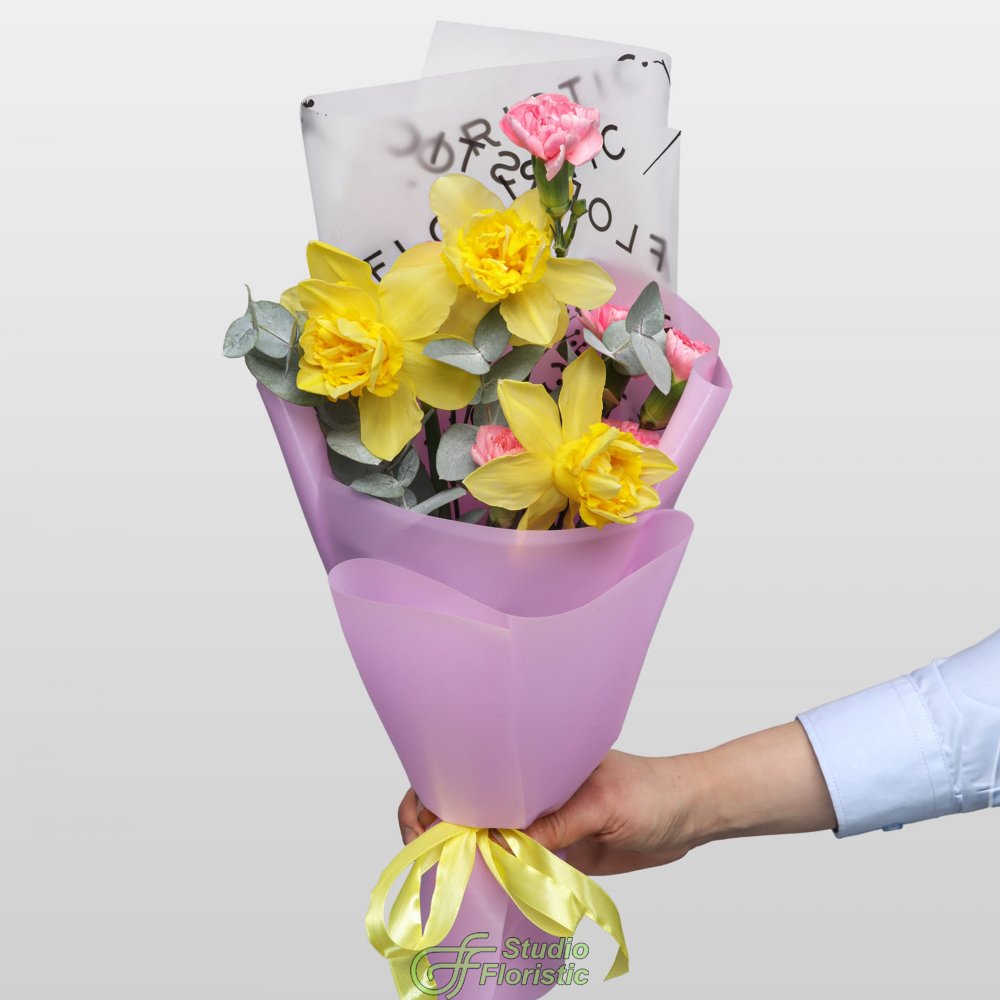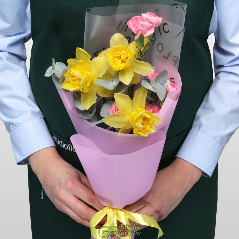 Нарцисс (3шт.); Гвоздика кустовая (2шт.); Эвкалипт; Упаковка; Атласная лента | 1499 | 2399 |