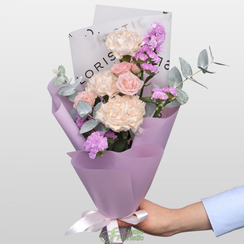 Кустовая Роза (1шт.); Диантус (3шт.); Статица (1шт.); Эвкалипт; Упаковка; Атласная лента | 1799 | 2849 |