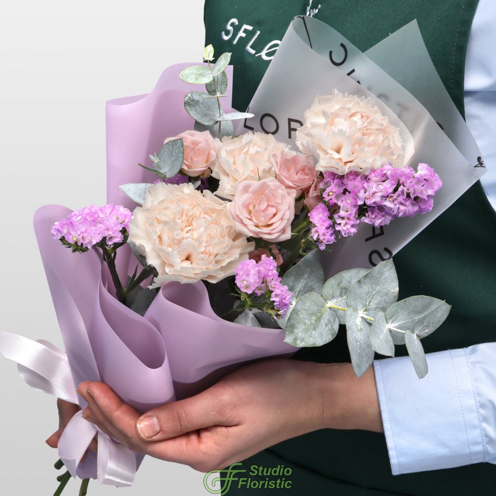 Кустовая Роза (1шт.); Диантус (3шт.); Статица (1шт.); Эвкалипт; Упаковка; Атласная лента | 1699 | 2649 |